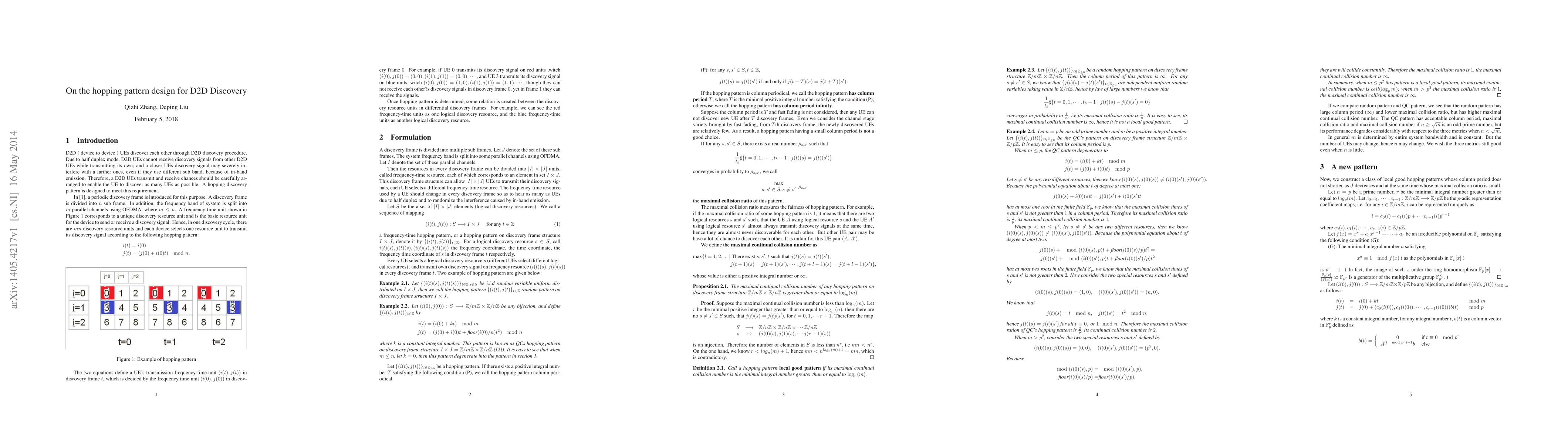 The hopping pattern for D2D Discovery are investi- gated. We propose three metrics for hopping pattern performance evaluation: column period, maximal collision ratio, maximal con- tinual collision number. A class of hopping patterns is constructed based on the metrics, and through simulation the patterns show better discovery performance.