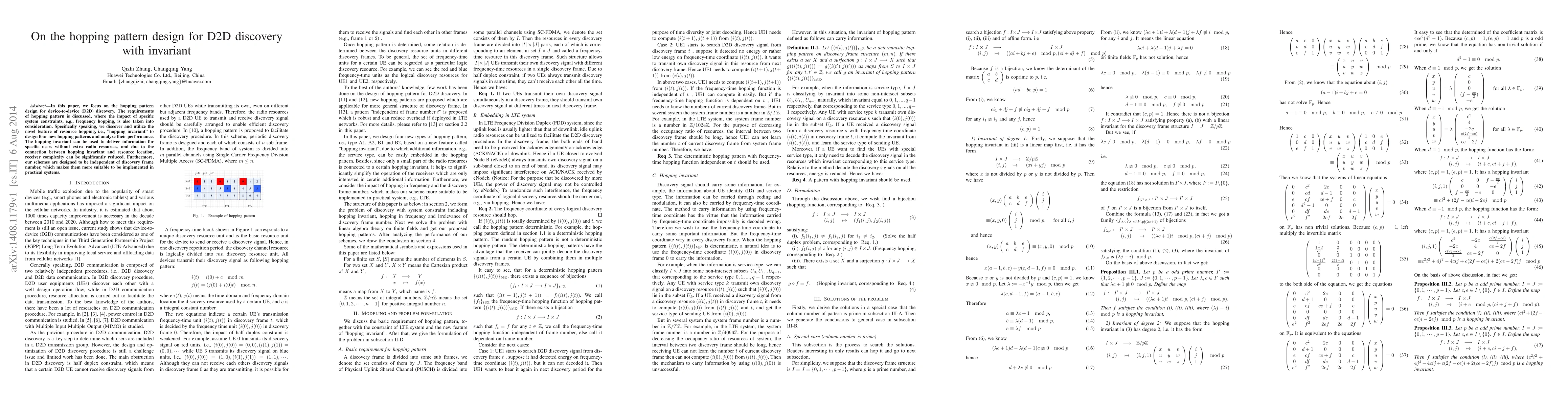 In this paper, we focus on the hopping pattern design for device-to-device (D2D) discovery. The requirements of hopping pattern is discussed, where the impact of specific system constraints, e.g., frequency hopping, is also taken into consideration. Specifically speaking, we discover and utilize the novel feature of resource hopping, i.e., "hopping invariant" to design four new hopping patterns and analyze their performance. The hopping invariant can be used to deliver information for specific users without extra radio resources, and due to the connection between hopping invariant and resource location, receiver complexity can be significantly reduced. Furthermore, our schemes are designed to be independent of discovery frame number, which makes them more suitable to be implemented in practical systems.