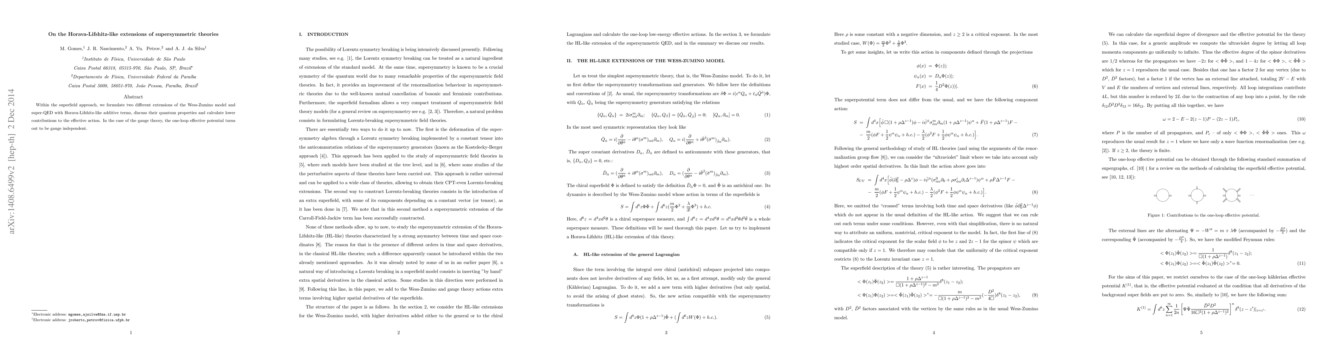 This paper formulates extensions of the Wess-Zumino model and super-QED with Horava-Lifshitz-like additive terms using the superfield approach, and investigates their quantum properties, finding that the one-loop effective potential in the gauge theory is gauge independent.