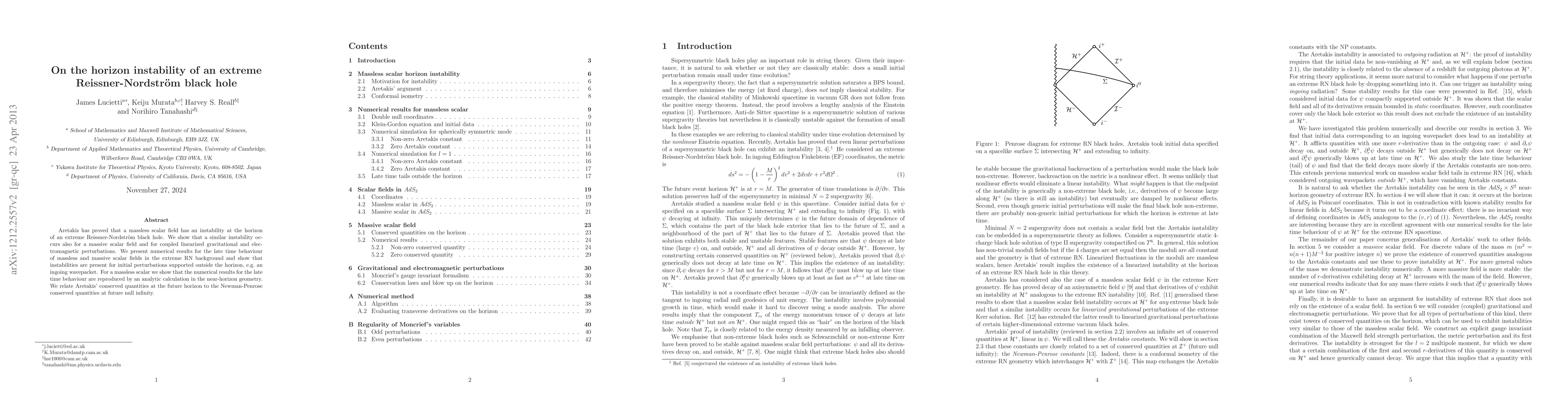 The paper introduces a detailed analysis of instabilities in extreme Reissner-Nordström black holes for massive scalar fields and coupled gravitational and electromagnetic perturbations, extending Aretakis' original findings to these cases.