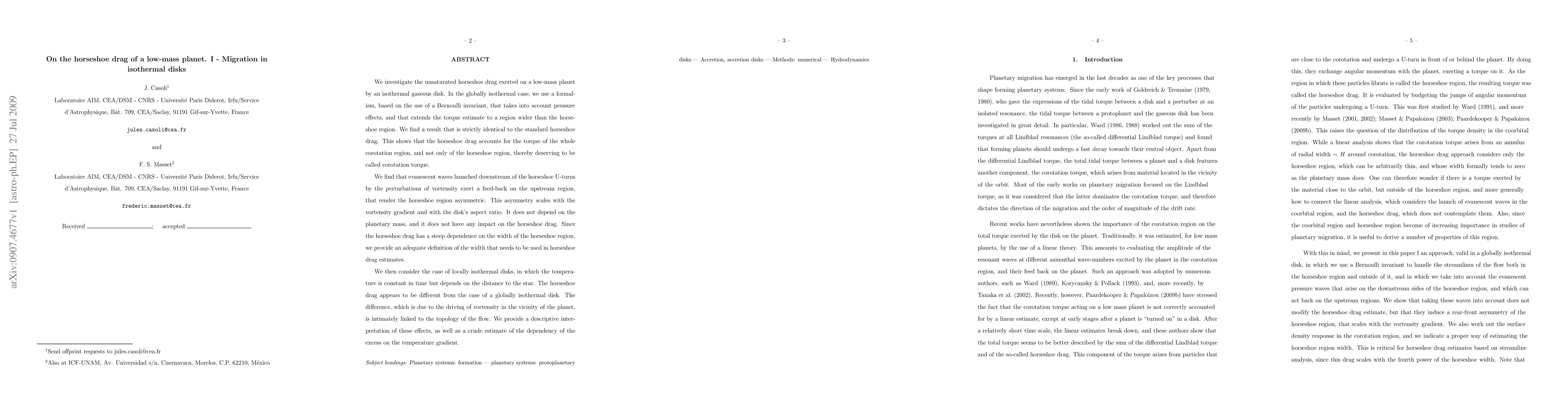 Researchers studied horseshoe drag on low-mass planets in isothermal gas disks, finding it strictly identical to the standard horseshoe drag and accounting for a wider region of the corotation area.
