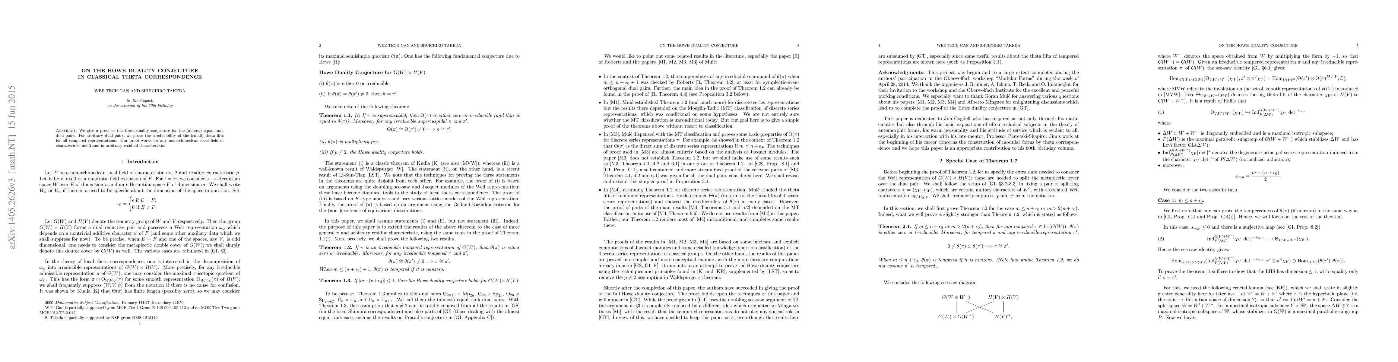 The paper proves the Howe duality conjecture for dual pairs of almost equal rank and demonstrates the irreducibility of small theta lifts for all tempered representations in the context of nonarchimedean local fields, regardless of residual characteristic.