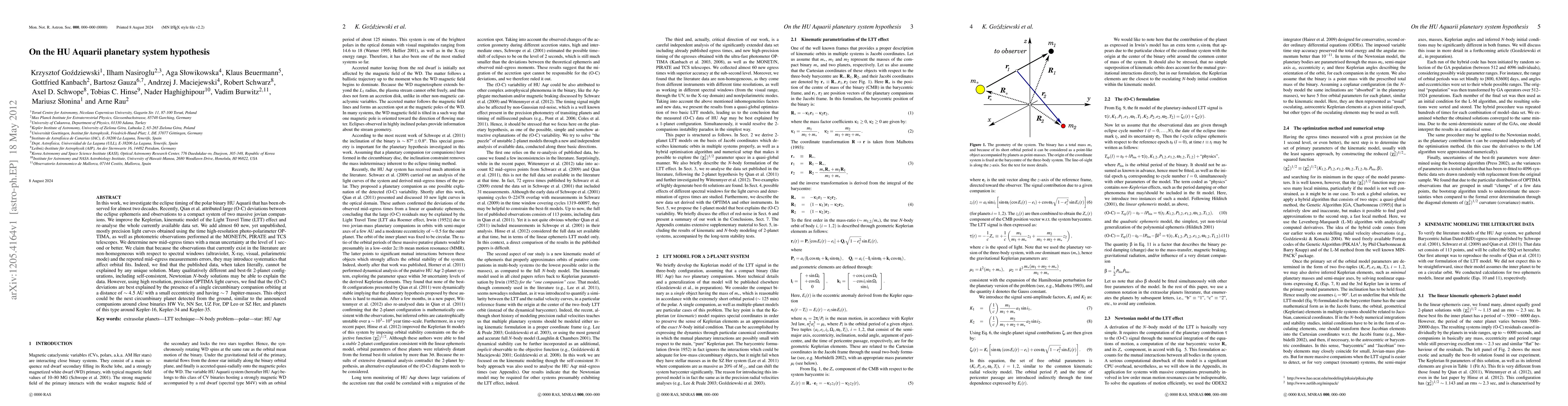 In this work, we investigate the eclipse timing of the polar binary HU Aquarii that has been observed for almost two decades. Recently, Qian et al. attributed large (O-C) deviations between the eclipse ephemeris and observations to a compact system of two massive jovian companions. We improve the Keplerian, kinematic model of the Light Travel Time (LTT) effect and re-analyse the whole currently available data set. We add almost 60 new, yet unpublished, mostly precision light curves obtained using the time high-resolution photo-polarimeter OPTIMA, as well as photometric observations performed at the MONET/N, PIRATE and TCS telescopes. We determine new mid--egress times with a mean uncertainty at the level of 1 second or better. We claim that because the observations that currently exist in the literature are non-homogeneous with respect to spectral windows (ultraviolet, X-ray, visual, polarimetric mode) and the reported mid--egress measurements errors, they may introduce systematics that affect orbital fits. Indeed, we find that the published data, when taken literally, cannot be explained by any unique solution. Many qualitatively different and best-fit 2-planet configurations, including self-consistent, Newtonian N-body solutions may be able to explain the data. However, using high resolution, precision OPTIMA light curves, we find that the (O-C) deviations are best explained by the presence of a single circumbinary companion orbiting at a distance of ~4.5 AU with a small eccentricity and having ~7 Jupiter-masses. This object could be the next circumbinary planet detected from the ground, similar to the announced companions around close binaries HW Vir, NN Ser, UZ For, DP Leo or SZ Her, and planets of this type around Kepler-16, Kepler-34 and Kepler-35.