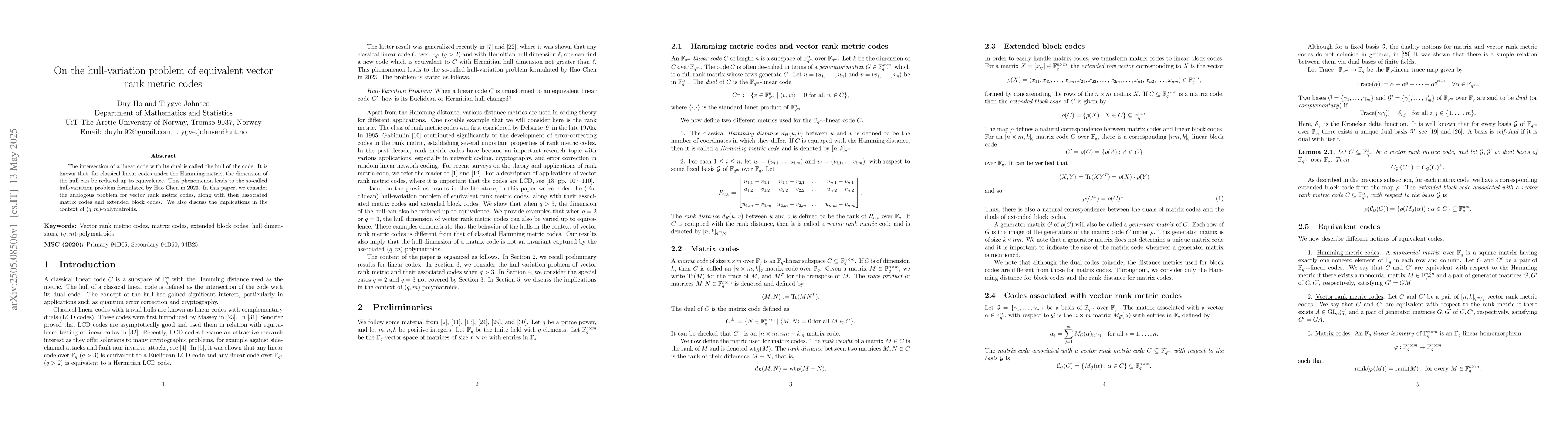 The paper considers the hull-variation problem for vector rank metric codes, matrix codes, and extended block codes, alongside their implications in the context of (q,m)-polymatroids.