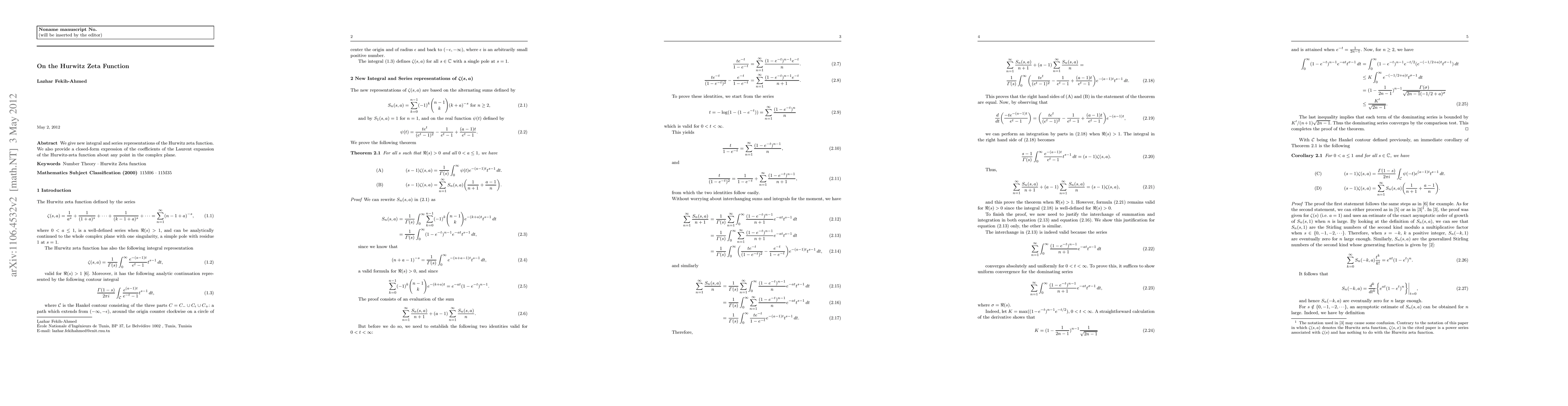 Summary: This paper presents new integral and series representations of the Hurwitz zeta function and derives a closed-form expression for the coefficients in its Laurent expansion around any point in the complex plane.