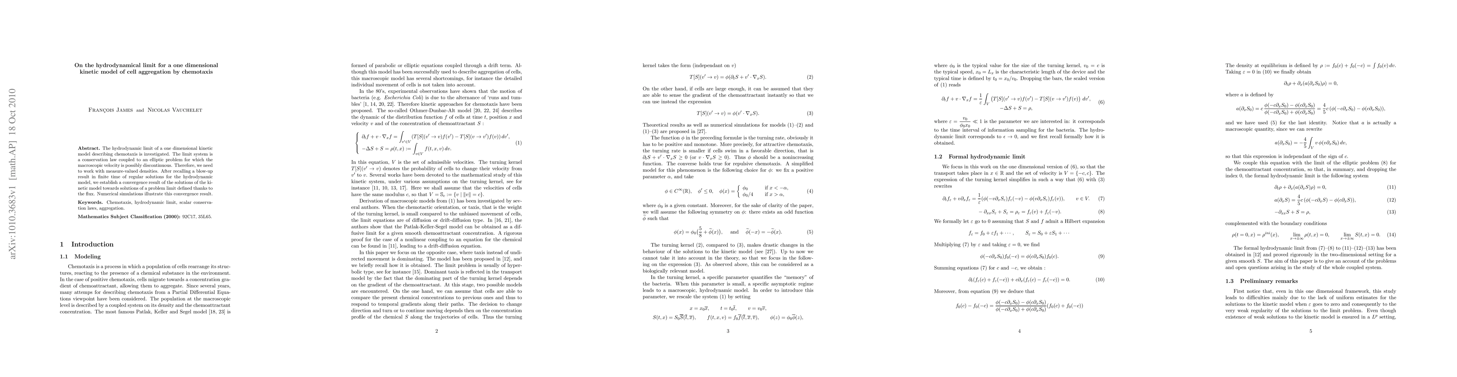 This paper investigates the hydrodynamic limit of a one-dimensional kinetic model for cell aggregation via chemotaxis, deriving a coupled conservation law and elliptic problem. It establishes convergence of kinetic model solutions to the limit system, illustrated by numerical simulations.