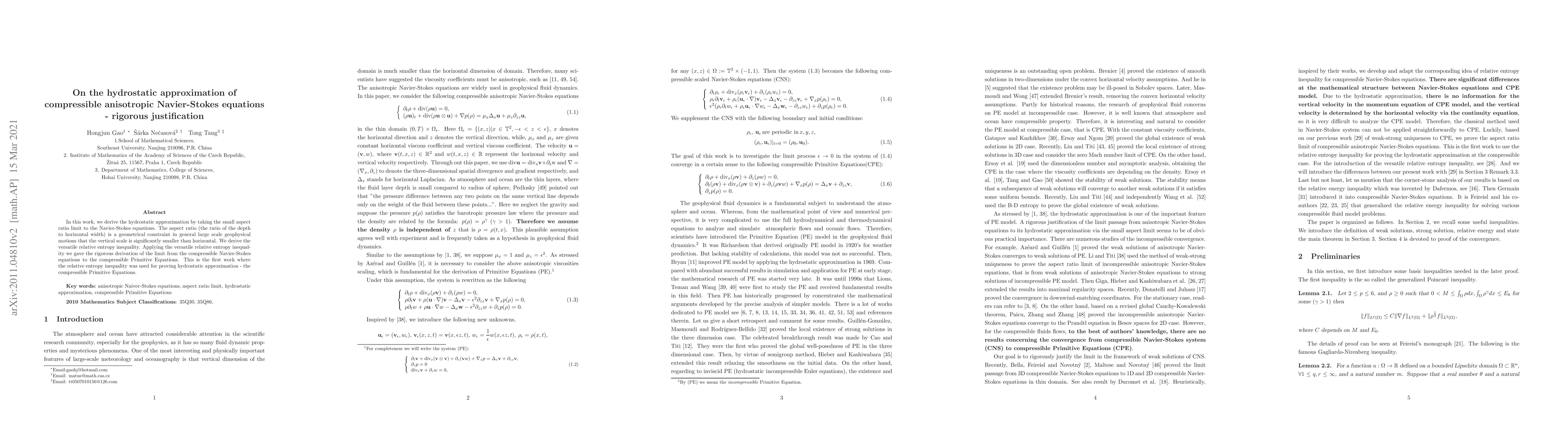 This paper rigorously justifies the hydrostatic approximation for compressible Navier-Stokes equations by taking the small aspect ratio limit, using the relative entropy inequality to bridge the transition to compressible Primitive Equations, marking the first application of this method for such approximations.