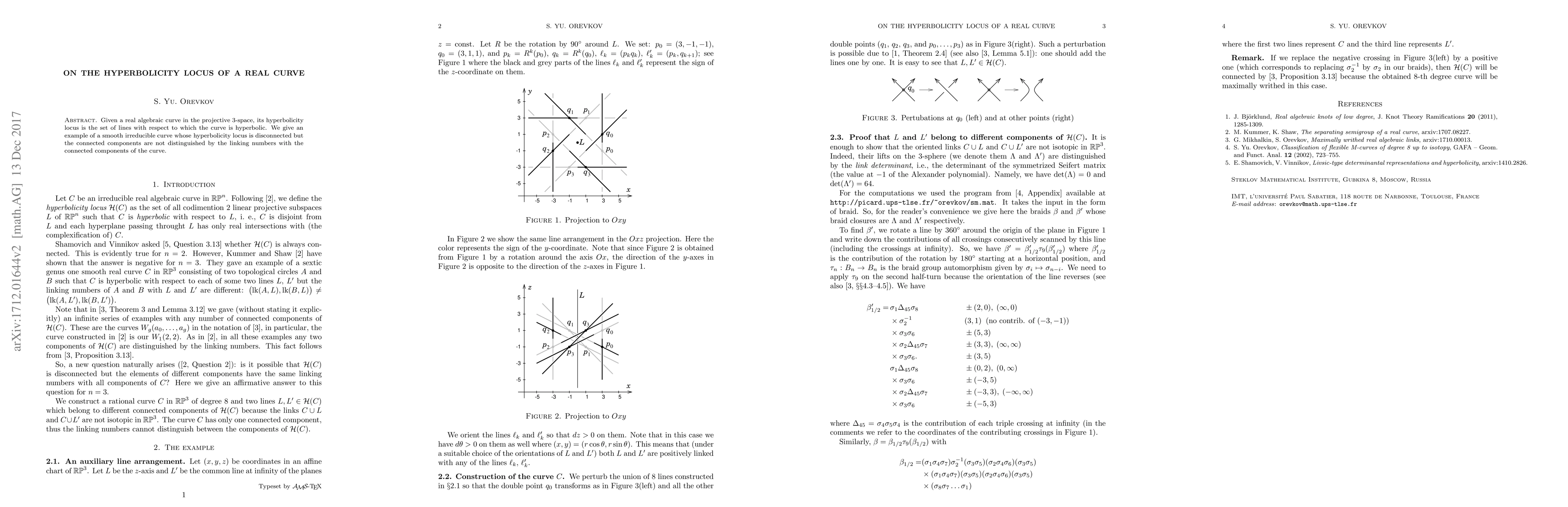 Summary: This paper examines the hyperbolicity locus of a smooth irreducible real algebraic curve in projective 3-space, illustrating a case where the locus is disconnected, yet its components cannot be differentiated by linking numbers with the curve's connected components.