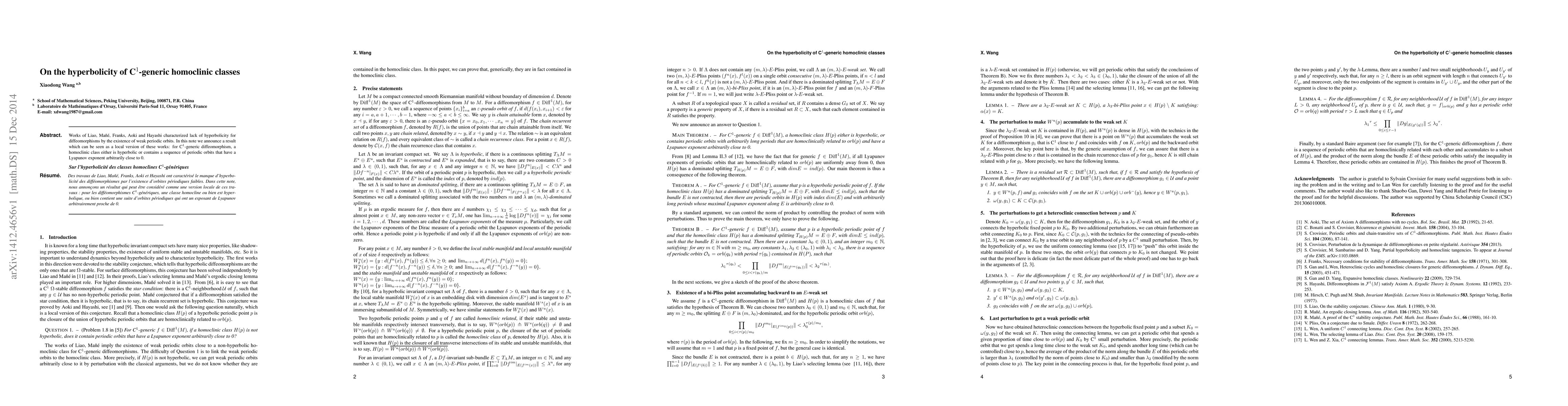 Works of Liao, Ma\~n\'e, Franks, Aoki and Hayashi characterized lack of hyperbolicity for diffeomorphisms by the existence of weak periodic orbits. In this note we announce a result which can be seen as a local version of these works: for C$^1$-generic diffeomorphism, a homoclinic class either is hyperbolic or contains a sequence of periodic orbits that have a Lyapunov exponent arbitrarily close to 0. Des travaux de Liao, Ma\~n\'e, Franks, Aoki et Hayashi ont caract\'eris\'e le manque d'hyperbolicit\'e des diff\'eomorphismes par l'existence d'orbites p\'eriodiques faibles. Dans cette note, nous annon\c{c}ons un r\'esultat qui peut \^{e}tre consid\'{e}r\'{e} comme une version locale de ces travaux: pour les diff\'{e}omorphismes C$^1$-g\'{e}n\'{e}riques, une classe homocline ou bien est hyperbolique, ou bien contient une suite d'orbites p\'{e}riodiques qui ont un exposant de Lyapunov arbitrairement proche de 0.