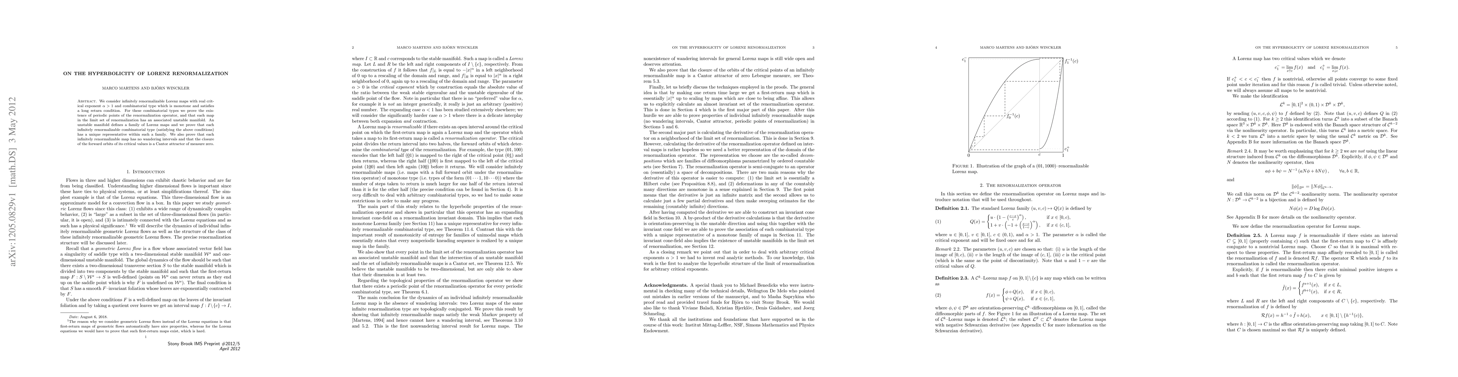 We consider infinitely renormalizable Lorenz maps with real critical exponent $\alpha>1$ and combinatorial type which is monotone and satisfies a long return condition. For these combinatorial types we prove the existence of periodic points of the renormalization operator, and that each map in the limit set of renormalization has an associated unstable manifold. An unstable manifold defines a family of Lorenz maps and we prove that each infinitely renormalizable combinatorial type (satisfying the above conditions) has a unique representative within such a family. We also prove that each infinitely renormalizable map has no wandering intervals and that the closure of the forward orbits of its critical values is a Cantor attractor of measure zero.