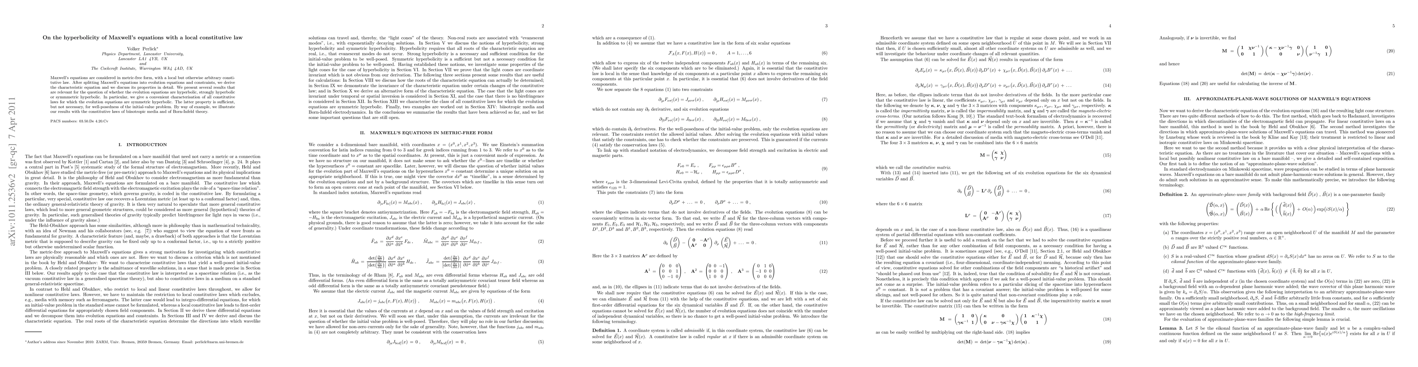 This paper investigates the hyperbolicity of Maxwell's equations under a local constitutive law, deriving the characteristic equation and discussing its properties. It provides a characterization of constitutive laws that ensure the evolution equations are symmetric hyperbolic, a sufficient condition for well-posedness, and illustrates these findings with examples from biisotropic media and Born-Infeld theory.