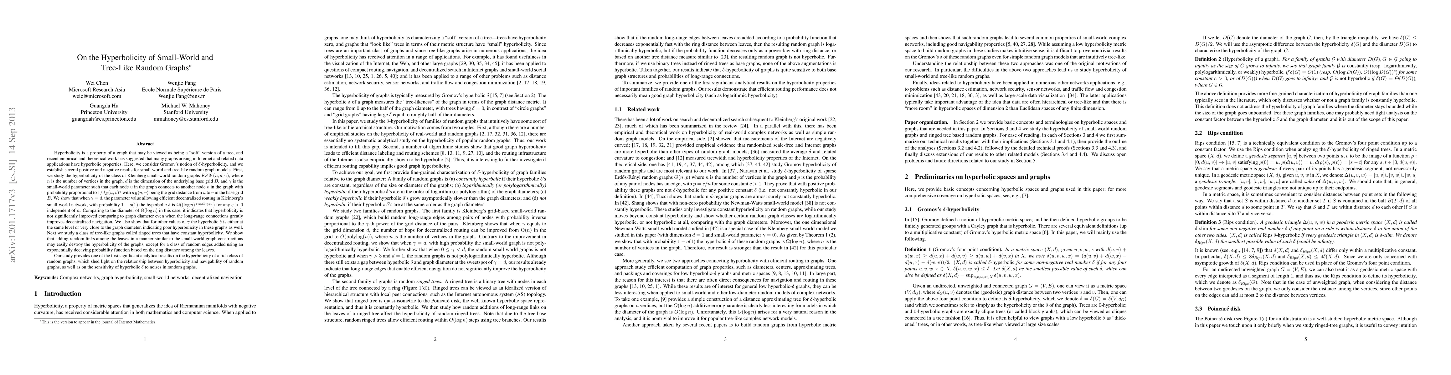 This paper investigates the hyperbolicity of small-world and tree-like random graphs, finding that Kleinberg small-world graphs do not significantly improve hyperbolicity despite enhanced navigation. It also reveals that ringed trees maintain constant hyperbolicity but can lose it when random links are added, except when edges are added with a specific decay function.