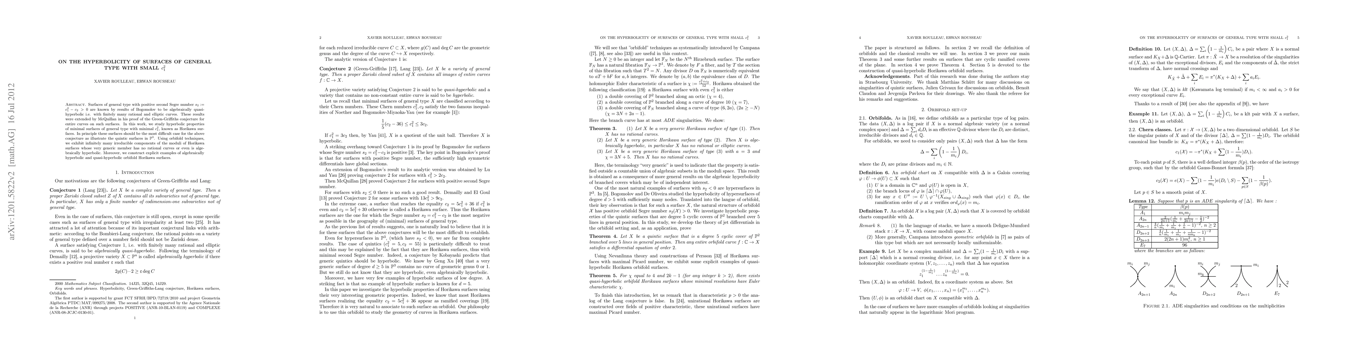 This paper explores the hyperbolicity of minimal surfaces of general type with small $c_1^2$ (Horikawa surfaces) using orbifold techniques, showing they have infinitely many irreducible components in moduli space, with very generic members being algebraically hyperbolic and no rational curves. Explicit examples of such surfaces are also constructed.