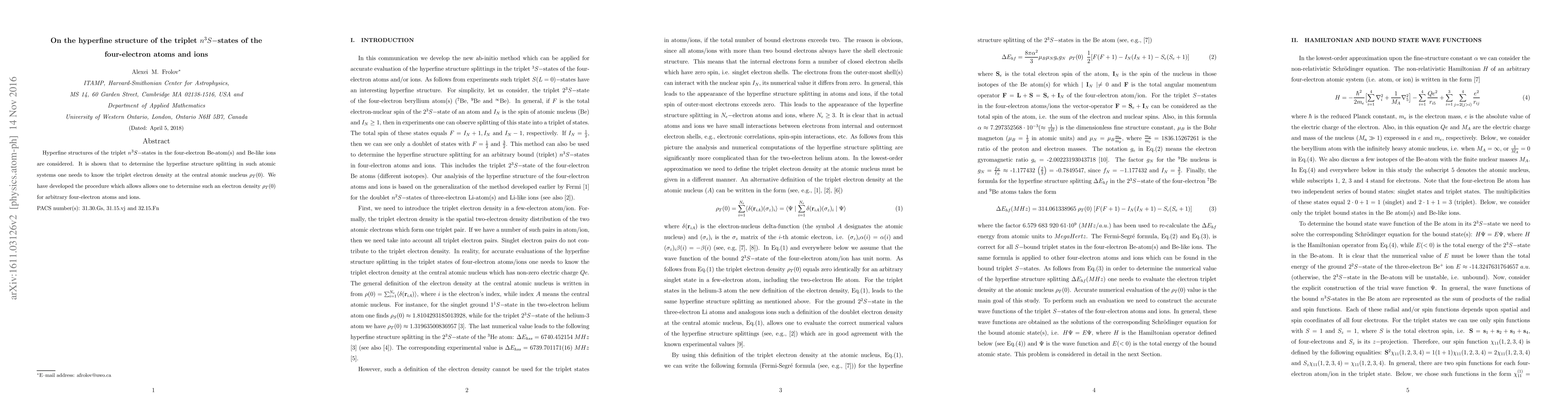 Hyperfine structures of the triplet $n^3S-$states in the four-electron Be-atom(s) and Be-like ions are considered. It is shown that to determine the hyperfine structure splitting in such atomic systems one needs to know the triplet electron density at the central atomic nucleus $\rho_T(0)$. We have developed the procedure which allows allows one to determine such an electron density $\rho_T(0)$ for arbitrary four-electron atoms and ions.