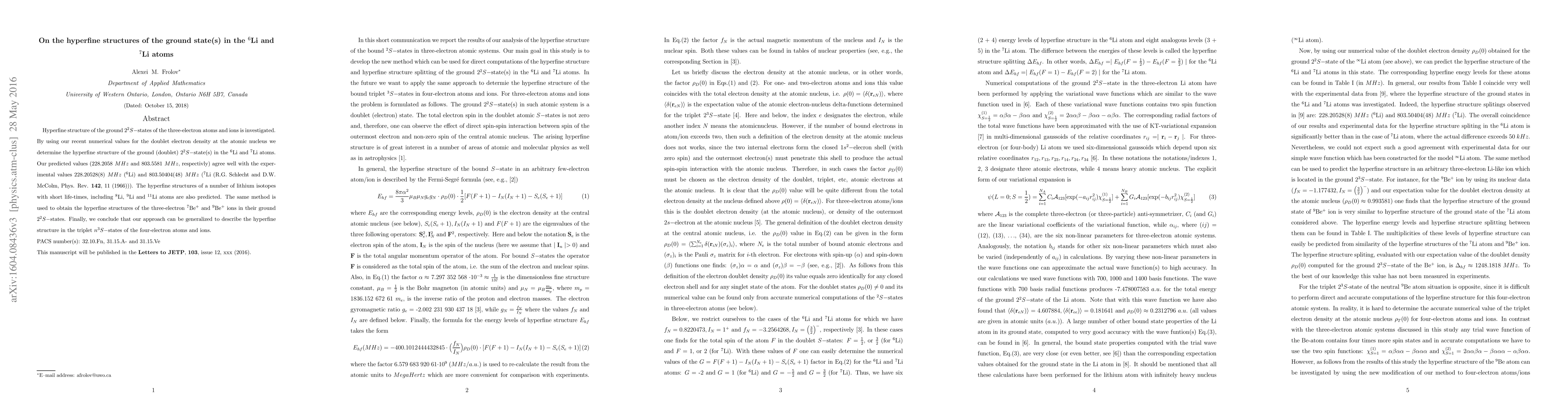 Hyperfine structure of the ground $2^{2}S-$states of the three-electron atoms and ions is investigated. By using our recent numerical values for the doublet electron density at the atomic nucleus we determine the hyperfine structure of the ground (doublet) $2^{2}S-$state(s) in the ${}^{6}$Li and ${}^{7}$Li atoms. Our predicted values (228.2058 $MHz$ and 803.5581 $MHz$, respectivly) agree well with the experimental values 228.20528(8) $MHz$ (${}^{6}$Li) and 803.50404(48) $MHz$ (${}^{7}$Li (R.G. Schlecht and D.W. McColm, Phys. Rev. \textbf{142}, 11 (1966))). The hyperfine structures of a number of lithium isotopes with short life-times, including ${}^{8}$Li, ${}^{9}$Li and ${}^{11}$Li atoms are also predicted. The same method is used to obtain the hyperfine structures of the three-electron ${}^{7}$Be$^{+}$ and ${}^{9}$Be$^{+}$ ions in their ground $2^{2}S-$states. Finally, we conclude that our approach can be generalized to describe the hyperfine structure in the triplet $n{}^{3}S-$states of the four-electron atoms and ions.