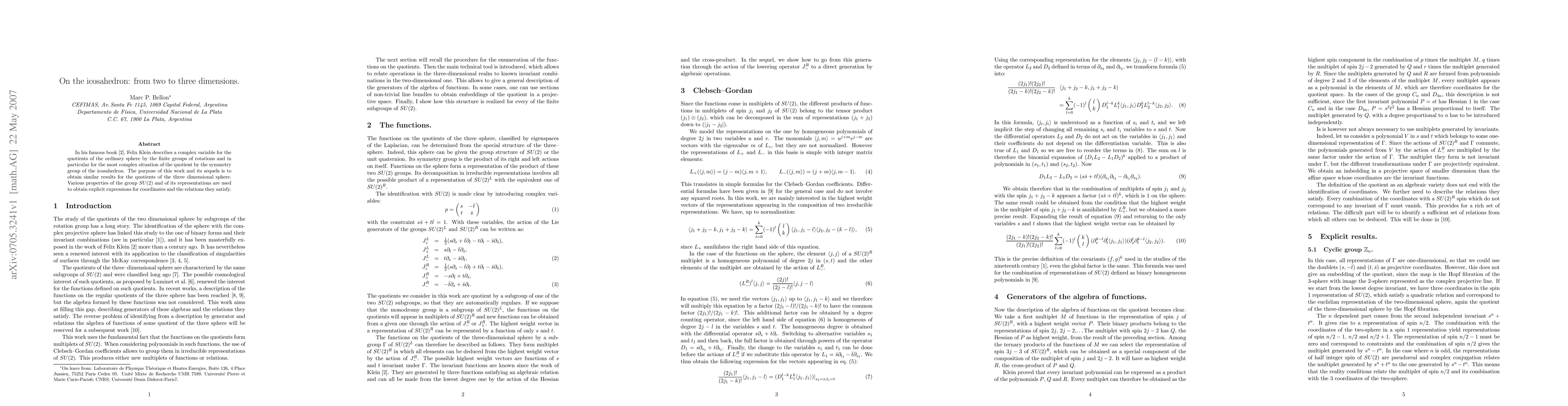 This paper extends Felix Klein's work on the quotients of the ordinary sphere by finite rotation groups to the three-dimensional sphere, focusing on the symmetry group of the icosahedron. It utilizes properties of $SU(2)$ and its representations to derive explicit coordinates and their relations.
