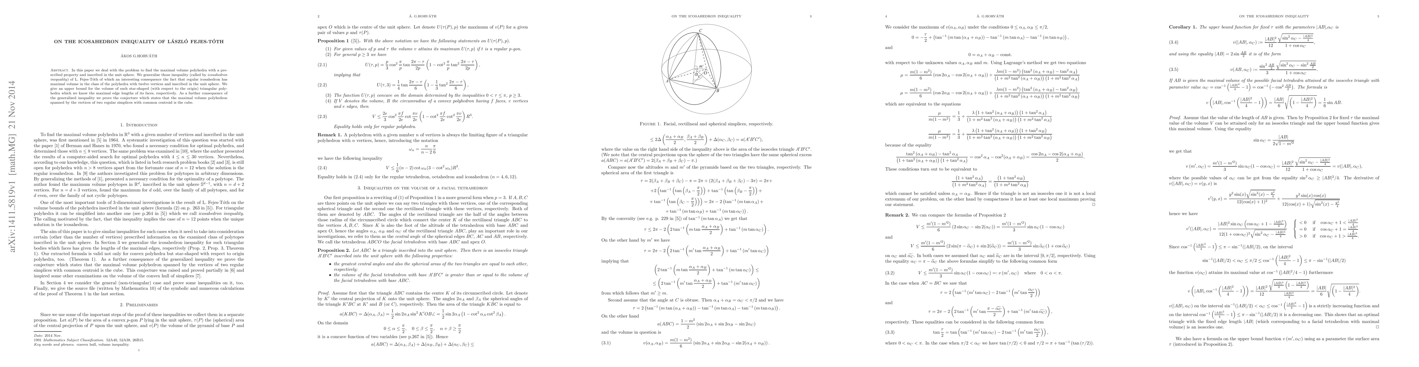 In this paper we deal with the problem to find the maximal volume polyhedra with a prescribed property and inscribed in the unit sphere. We generalize those inequality (called by \emph{icosahedron inequality}) of L. Fejes-T\'oth of which an interesting consequence the fact that regular icosahedron has maximal volume in the class of the polyhedra with twelve vertices and inscribed in the unit sphere. We give an upper bound for the volume of such star-shaped (with respect to the origin) triangular polyhedra which we know the maximal edge lengths of its faces, respectively. As a further consequence of the generalized inequality we prove the conjecture which states that the maximal volume polyhedron spanned by the vertices of two regular simplices with common centroid is the cube.