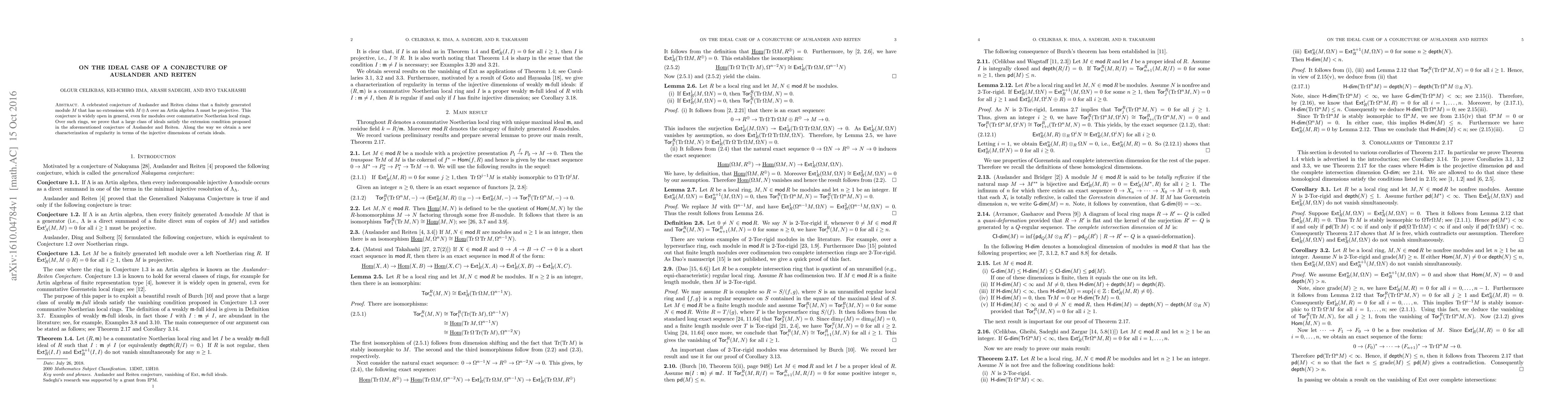 Summary: The paper proves that a significant class of ideals over commutative Noetherian local rings satisfy the extension condition of Auslander and Reiten's conjecture, and introduces a new characterization of regularity based on injective dimensions.