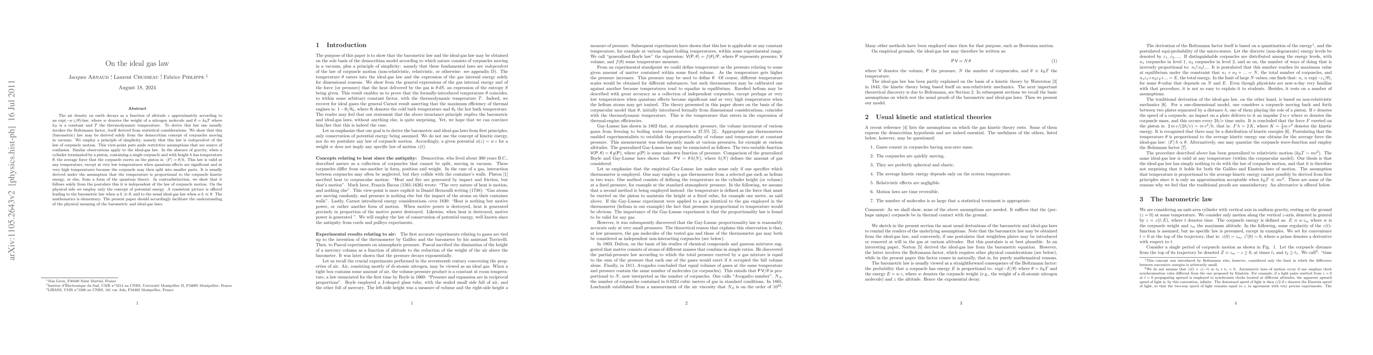 The air density on earth decays as a function of altitude $z$ approximately according to an $\exp(-w\,z/\theta)$-law, where $w$ denotes the weight of a nitrogen molecule and $\theta=\kB T$ where $k_B$ is a constant and $T$ the thermodynamic temperature. To derive this law one usually invokes the Boltzmann factor, itself derived from statistical considerations. We show that this (barometric) law may be derived solely from the democritian concept of corpuscles moving in vacuum. We employ a principle of simplicity, namely that this law is \emph{independent} of the law of corpuscle motion. This view-point puts aside restrictive assumptions that are source of confusion. Similar observations apply to the ideal-gas law. In the absence of gravity, when a cylinder terminated by a piston, containing a single corpuscle and with height $h$ has temperature $\theta$, the average force that the corpuscle exerts on the piston is: $\ave{F}=\theta/h$. This law is valid at any temperature, except at very low temperatures when quantum effects are significant and at very high temperatures because the corpuscle may then split into smaller parts. It is usually derived under the assumption that the temperature is proportional to the corpuscle kinetic energy, or else, from a form of the quantum theory. In contradistinction, we show that it follows solely from the postulate this it is independent of the law of corpuscle motion. On the physical side we employ only the concept of potential energy. A consistent picture is offered leading to the barometric law when $w\,h\gg\theta$, and to the usual ideal-gas law when $w\,h\ll\theta$. The mathematics is elementary. The present paper should accordingly facilitate the understanding of the physical meaning of the barometric and ideal-gas laws.