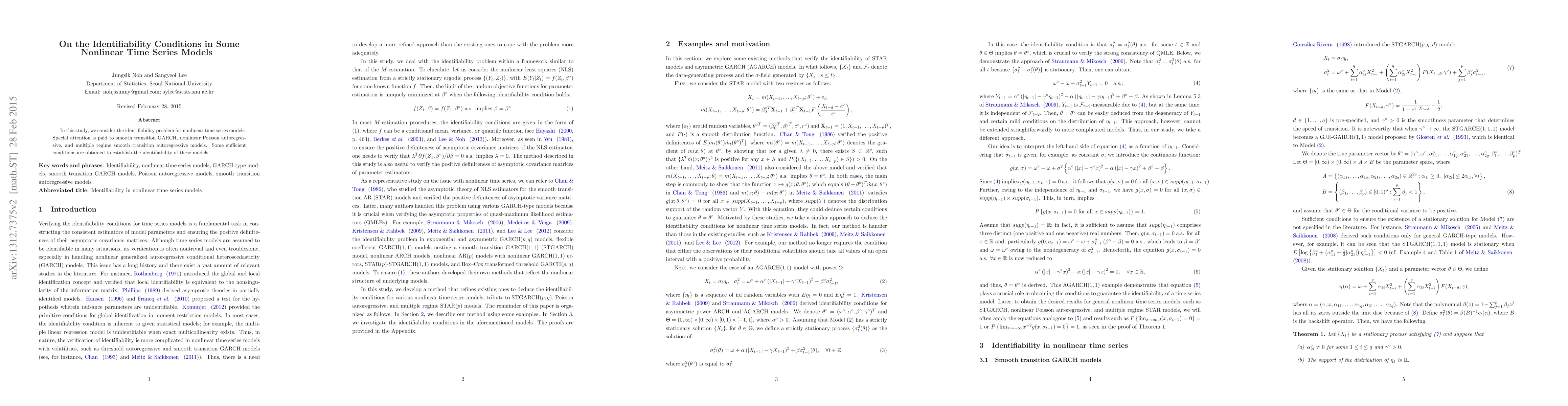 This paper investigates the identifiability conditions for several nonlinear time series models, including smooth transition GARCH, nonlinear Poisson autoregressive, and multiple regime smooth transition autoregressive models, and provides sufficient conditions to establish their identifiability.