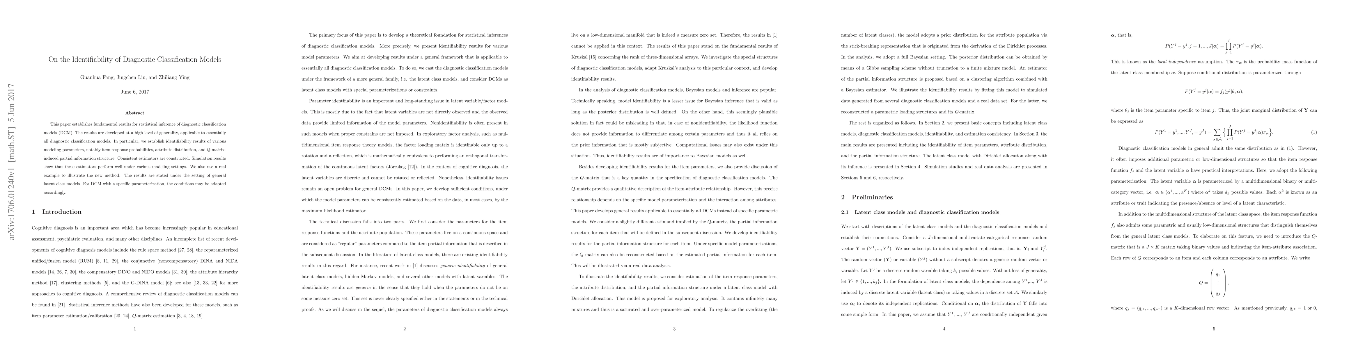 This paper establishes general identifiability results for diagnostic classification models, focusing on parameters like item response probabilities and attribute distributions. It constructs consistent estimators and demonstrates their effectiveness through simulations and a real-world example.