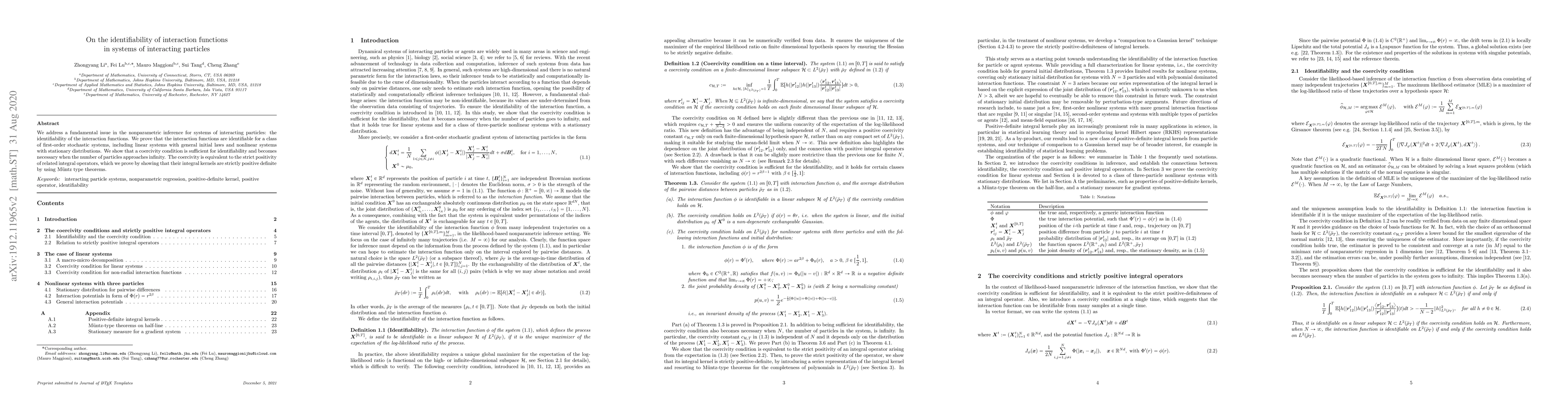 We address a fundamental issue in the nonparametric inference for systems of interacting particles: the identifiability of the interaction functions. We prove that the interaction functions are identifiable for a class of first-order stochastic systems, including linear systems with general initial laws and nonlinear systems with stationary distributions. We show that a coercivity condition is sufficient for identifiability and becomes necessary when the number of particles approaches infinity. The coercivity is equivalent to the strict positivity of related integral operators, which we prove by showing that their integral kernels are strictly positive definite by using M\"untz type theorems.