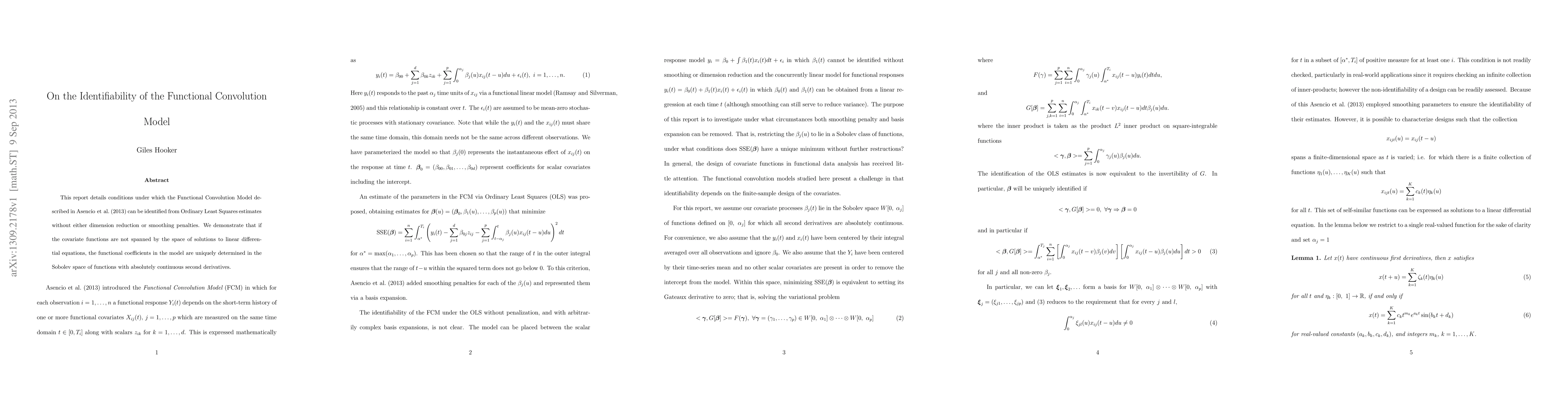 This report details conditions under which the Functional Convolution Model described in \citet{AHG13} can be identified from Ordinary Least Squares estimates without either dimension reduction or smoothing penalties. We demonstrate that if the covariate functions are not spanned by the space of solutions to linear differential equations, the functional coefficients in the model are uniquely determined in the Sobolev space of functions with absolutely continuous second derivatives.