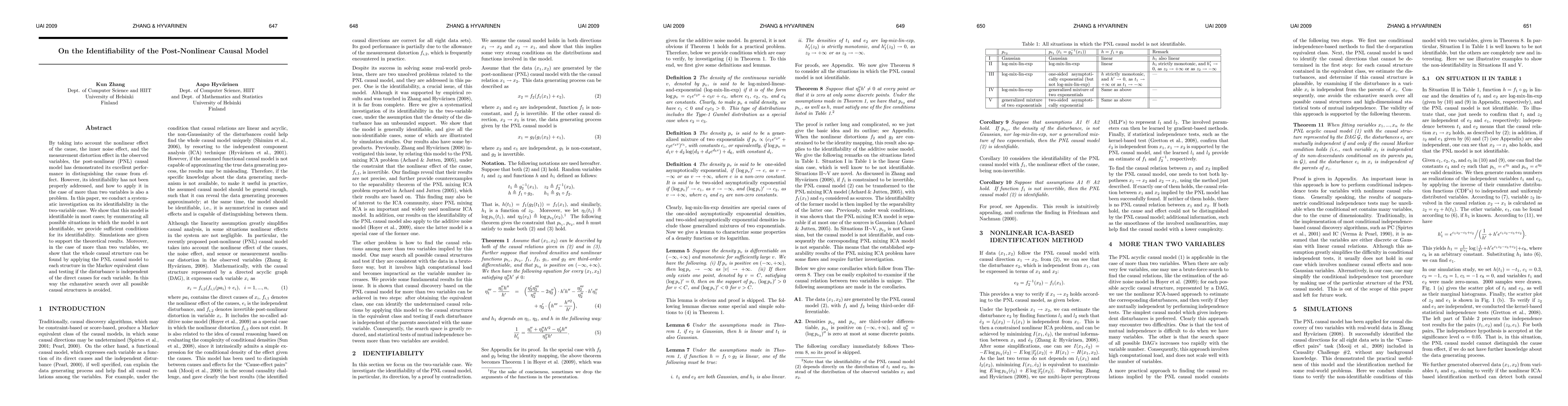This paper investigates the identifiability of the post-nonlinear causal model, demonstrating its applicability in distinguishing causes from effects while considering nonlinear effects, inner noise, and measurement distortions. It establishes sufficient conditions for identifiability in the two-variable case and proposes a method to determine the causal structure in cases with more than two variables without exhaustive searches.