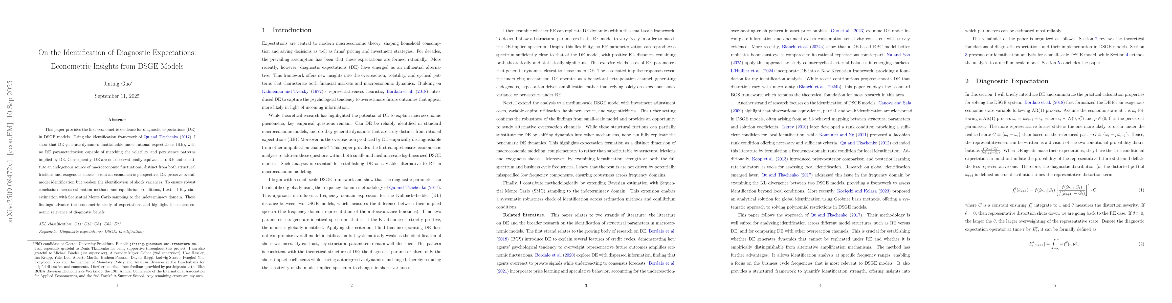 This paper provides the first econometric evidence for diagnostic expectations (DE) in DSGE models. Using the identification framework of Qu and Tkachenko (2017), I show that DE generate dynamics unattainable under rational expectations (RE), with no RE parameterization capable of matching the volatility and persistence patterns implied by DE. Consequently, DE are not observationally equivalent to RE and constitute an endogenous source of macroeconomic fluctuations, distinct from both structural frictions and exogenous shocks. From an econometric perspective, DE preserve overall model identification but weaken the identification of shock variances. To ensure robust conclusions across estimation methods and equilibrium conditions, I extend Bayesian estimation with Sequential Monte Carlo sampling to the indeterminacy domain. These findings advance the econometric study of expectations and highlight the macroeconomic relevance of diagnostic beliefs.