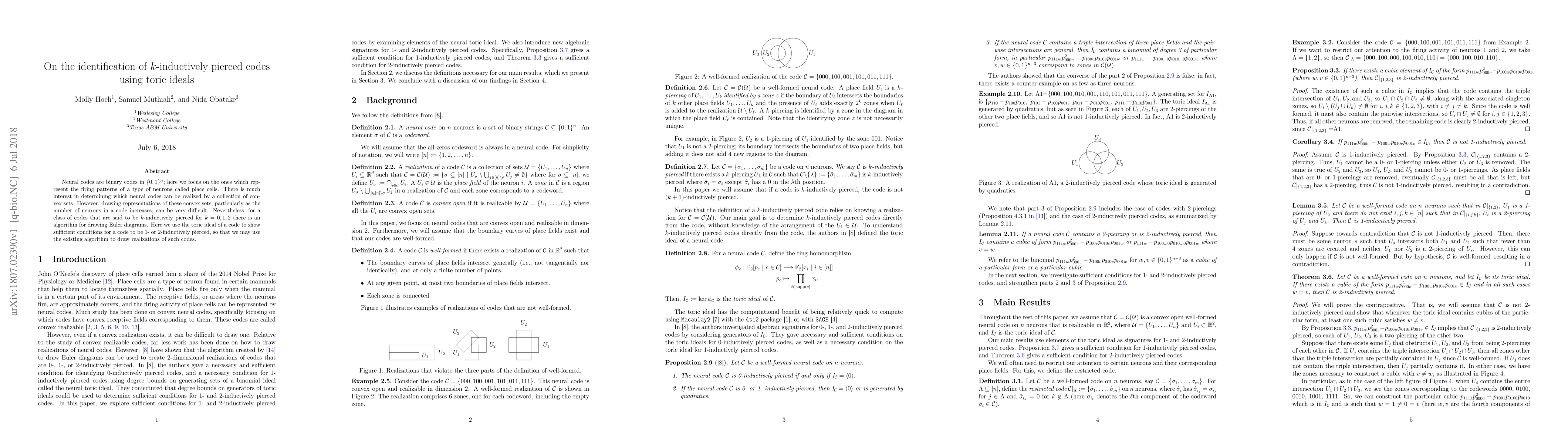 Neural codes are binary codes in $\{0,1\}^n$; here we focus on the ones which represent the firing patterns of a type of neurons called place cells. There is much interest in determining which neural codes can be realized by a collection of convex sets. However, drawing representations of these convex sets, particularly as the number of neurons in a code increases, can be very difficult. Nevertheless, for a class of codes that are said to be $k$-inductively pierced for $k=0,1,2$ there is an algorithm for drawing Euler diagrams. Here we use the toric ideal of a code to show sufficient conditions for a code to be 1- or 2-inductively pierced, so that we may use the existing algorithm to draw realizations of such codes.
