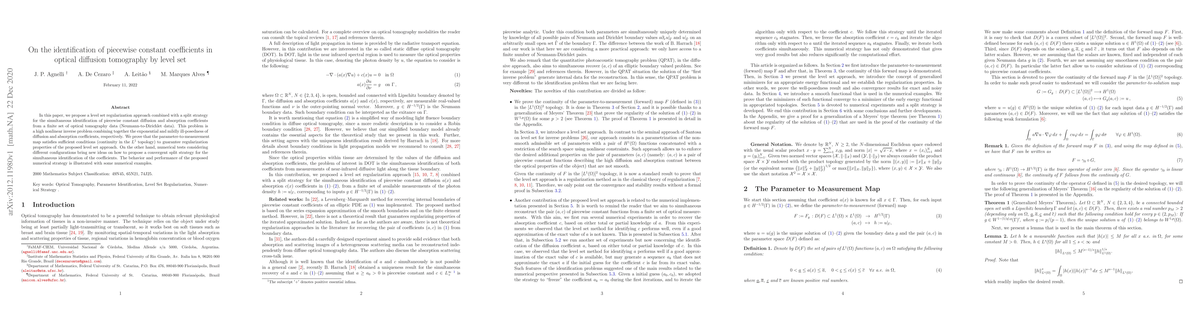 In this paper, we propose a level set regularization approach combined with a split strategy for the simultaneous identification of piecewise constant diffusion and absorption coefficients from a finite set of optical tomography data (Neumann-to-Dirichlet data). This problem is a high nonlinear inverse problem combining together the exponential and mildly ill-posedness of diffusion and absorption coefficients, respectively. We prove that the parameter-to-measurement map satisfies sufficient conditions (continuity in the $L^1$ topology) to guarantee regularization properties of the proposed level set approach. On the other hand, numerical tests considering different configurations bring new ideas on how to propose a convergent split strategy for the simultaneous identification of the coefficients. The behavior and performance of the proposed numerical strategy is illustrated with some numerical examples.