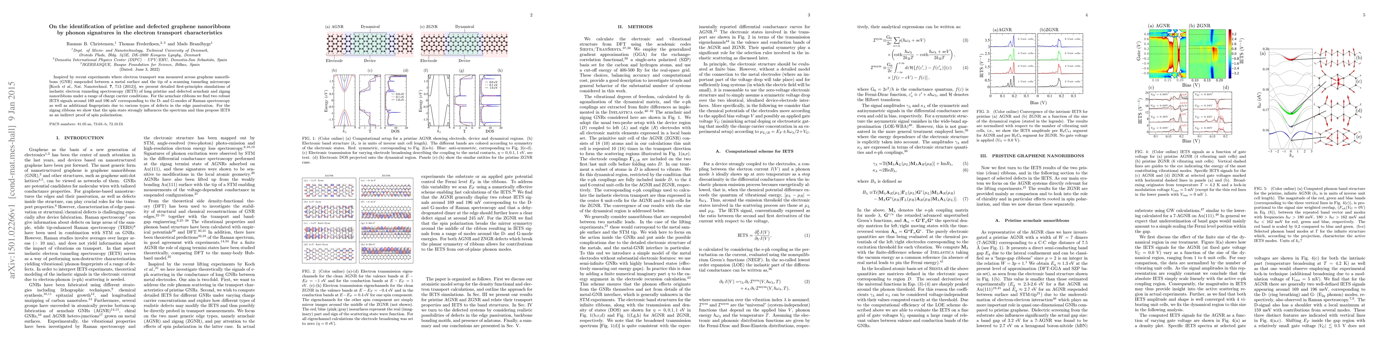 This paper uses first-principles simulations to identify phonon signatures in the electron transport characteristics of pristine and defected graphene nanoribbons, revealing distinct IETS signals for armchair and zigzag ribbons that can distinguish between different types of defects and spin states.