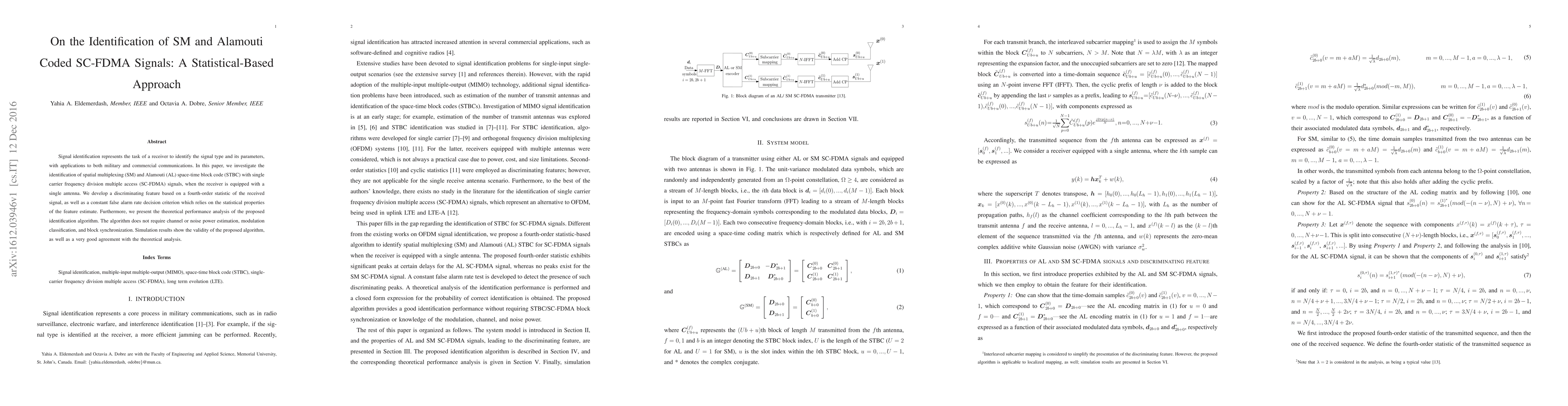 This paper proposes a statistical-based method for identifying spatial multiplexing (SM) and Alamouti coded single carrier frequency division multiple access (SC-FDMA) signals using a single antenna receiver. The method employs a fourth-order statistic feature and a constant false alarm rate decision criterion, demonstrating good performance without requiring channel or noise power estimation.