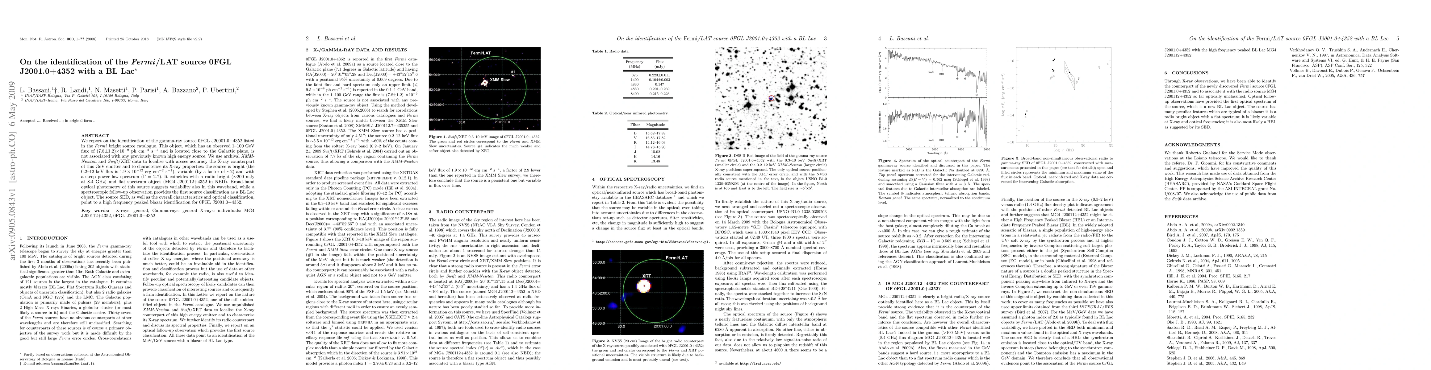 We report on the identification of the gamma-ray source 0FGL J20001.0+4352 listed in the Fermi bright source catalogue. This object, which has an observed 1-100 GeV flux of (7.8 +/- 1.2) x 10^{-9} ph cm^{-2} s^{-1} and is located close to the Galactic plane, is not associated with any previously known high energy source. We use archival XMM-Newton and Swift/XRT data to localise with arcsec accuracy the X-ray counterpart of this GeV emitter and to characterise its X-ray properties: the source is bright (the 0.2-12 keV flux is 1.9 x 10^{-12} erg cm^{-2} s^{-1}), variable (by a factor of ~2) and with a steep power law spectrum (Gamma = 2.7). It coincides with a radio bright (~200 mJy at 8.4 GHz) and flat spectrum object (MG4 J200112+4352 in NED). Broad-band optical photometry of this source suggests variability also in this waveband, while a spectroscopic follow-up observation provides the first source classification as a BL Lac object. The source SED, as well as the overall characteristics and optical classification, point to a high frequency peaked blazar identification for 0FGL J2001.0+4352.