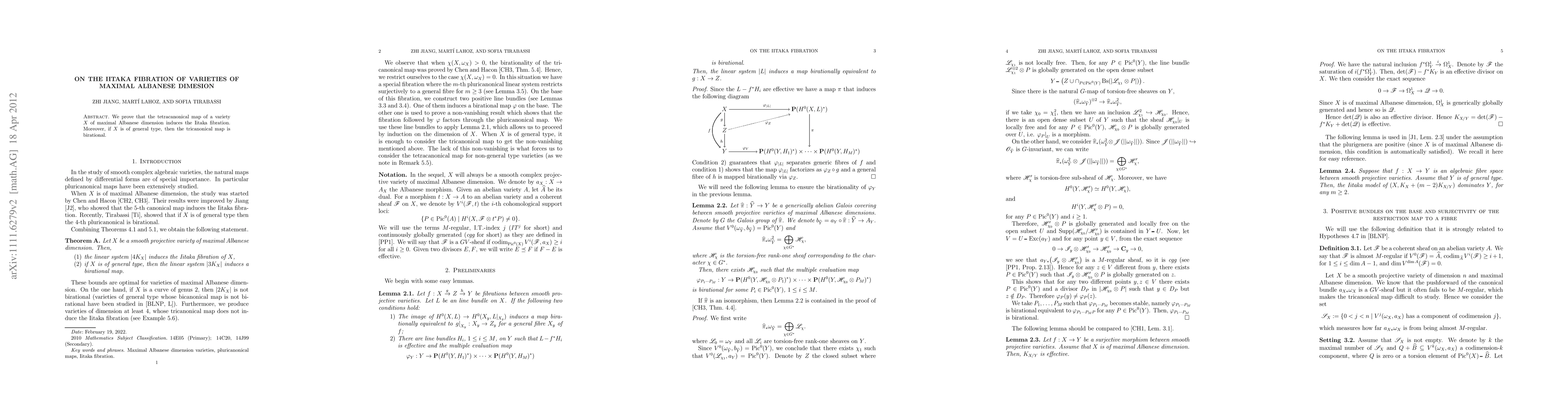 Summary: This paper demonstrates that the tetracanonical map of a variety with maximal Albanese dimension generates the Iitaka fibration, and for varieties of general type, the tricanonical map is shown to be birational.