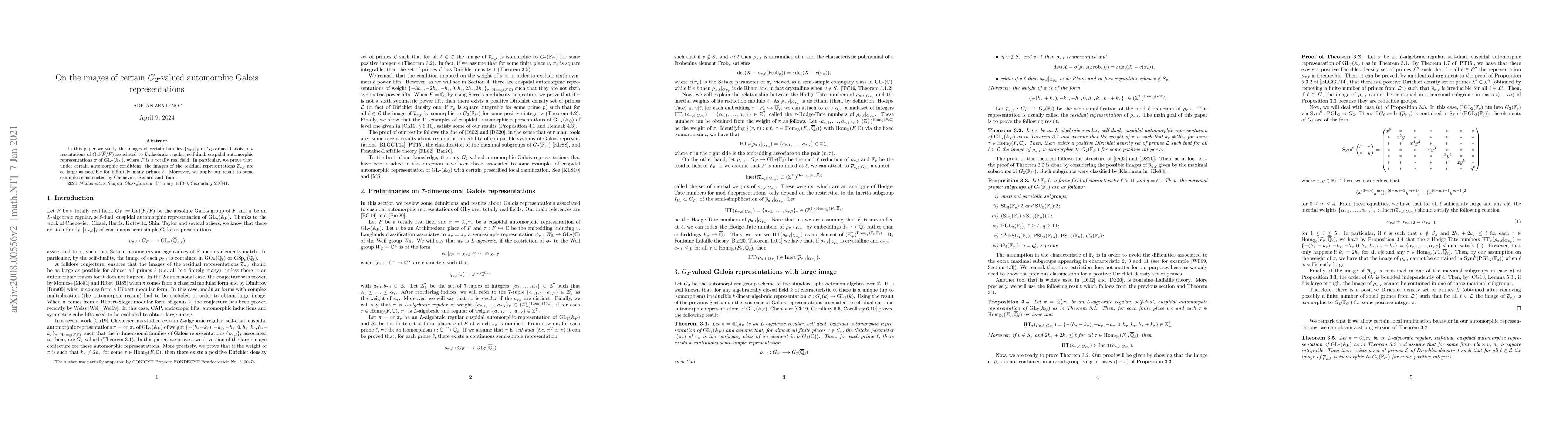 In this paper we study the images of certain families $\{\rho_{\pi,\ell} \}_\ell$ of $G_2$-valued Galois representations of $\mbox{Gal}(\overline{F}/F)$ associated to $L$-algebraic regular, self-dual, cuspidal automorphic representations $\pi$ of $\mbox{GL}_7(\mathbb{A}_F)$, where $F$ is a totally real field. In particular, we prove that, under certain automorphic conditions, the images of the residual representations $\overline{\rho}_{\pi,\ell}$ are as large as possible for infinitely many primes $\ell$. Moreover, we apply our result to some examples constructed by Chenevier, Renard and Ta\"ibi.