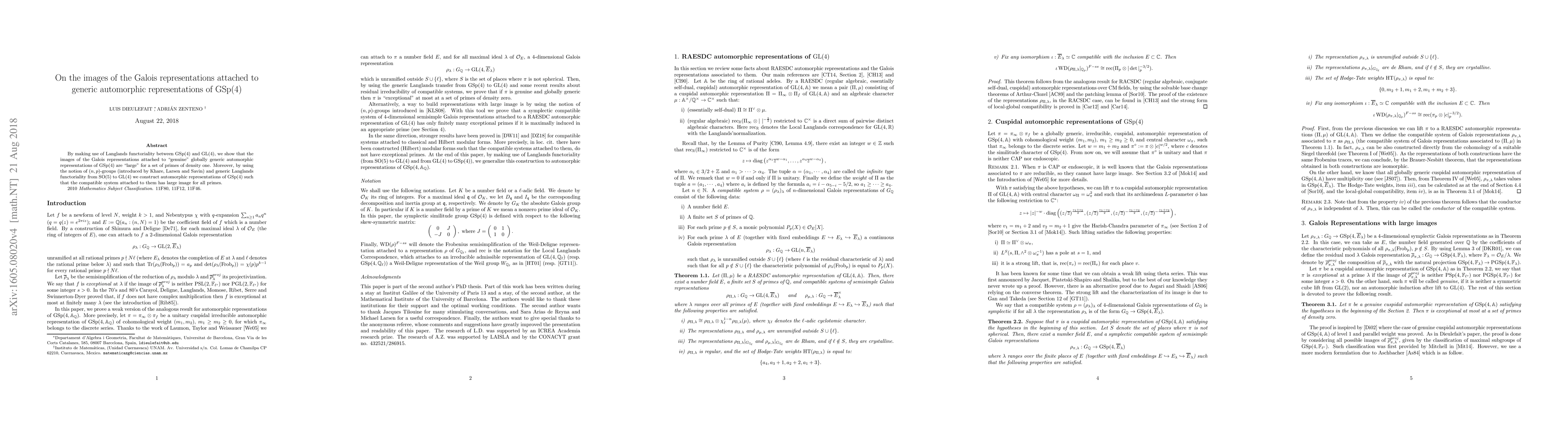 This paper demonstrates that Galois representations derived from "genuine" globally generic automorphic representations of GSp(4) exhibit large images for almost every prime, leveraging Langlands functoriality. Additionally, it constructs automorphic representations of GSp(4) with large compatible system images for all primes using (n,p)-groups and generic Langlands functoriality from SO(5) to GL(4).