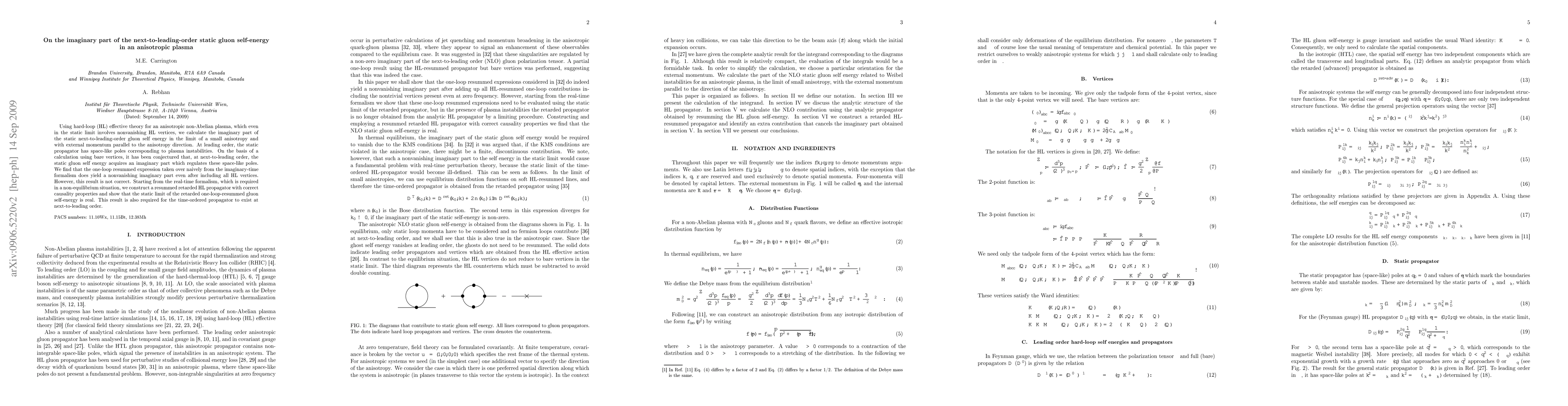 This paper calculates the imaginary part of the next-to-leading-order static gluon self-energy in an anisotropic plasma using hard-loop effective theory. It finds that contrary to previous conjectures, the static gluon self-energy remains real in the static limit, ensuring the existence of the time-ordered propagator.