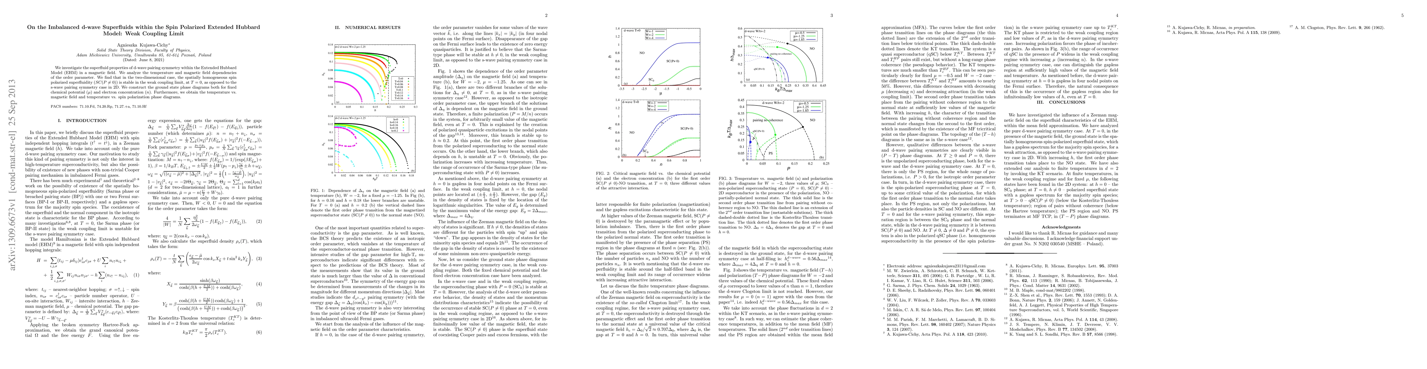 This paper examines the superfluid properties of d-wave pairing in the Extended Hubbard Model under a magnetic field, finding that spin-polarized superfluidity is stable in 2D at T=0 in the weak coupling limit. The study constructs phase diagrams for chemical potential and electron concentration, and explores temperature vs. magnetic field and temperature vs. spin polarization relationships.