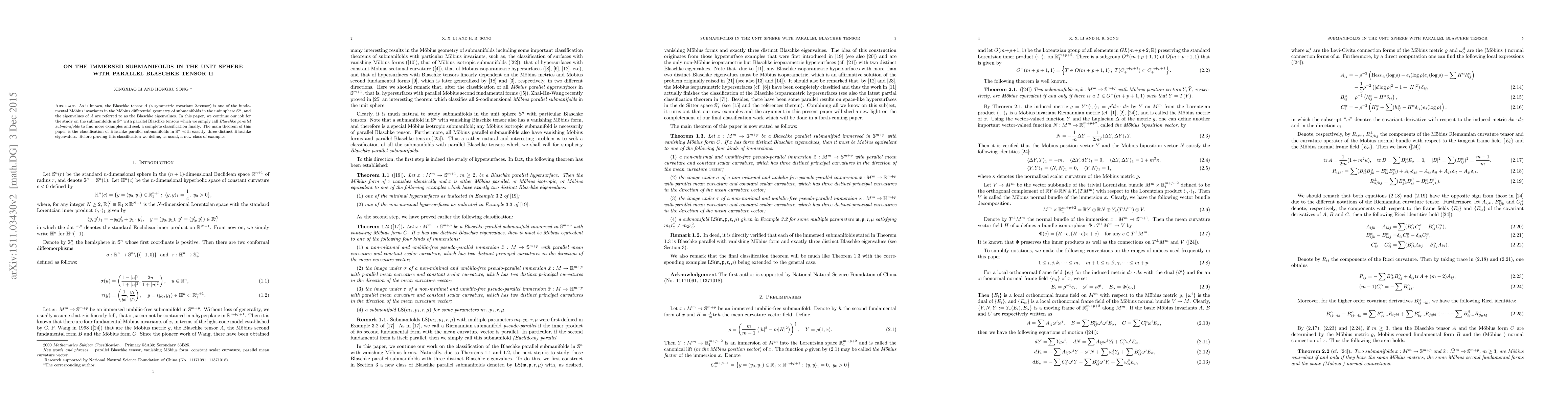 As is known, the Blaschke tensor $A$ (a symmetric covariant $2$-tensor) is one of the fundamental M\"obius invariants in the M\"obius differential geometry of submanifolds in the unit sphere $\mathbb S^n$, and the eigenvalues of $A$ are referred to as the Blaschke eigenvalues. In this paper, we continue our job for the study on the submanifolds in $\bbs^n$ with parallel Blaschke tensors which we simply call {\em Blaschke parallel submanifolds} to find more examples and seek a complete classification finally. The main theorem of this paper is the classification of Blaschke parallel submanifolds in $\mathbb S^n$ with exactly three distinct Blaschke eigenvalues. Before proving this classification we define, as usual, a new class of examples.