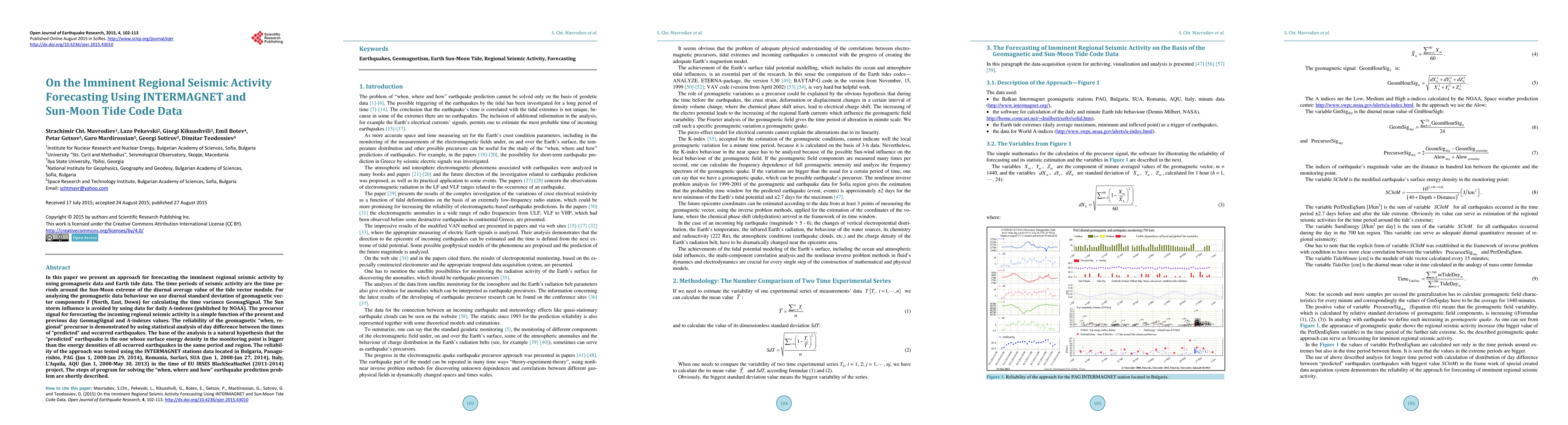 In this paper we present an approach for forecasting the imminent regional seismic activity by using geomagnetic data and Earth tide data. The time periods of seismic activity are the time periods around the Sun-Moon extreme of the diurnal average value of the tide vector module. For analyzing the geomagnetic data behaviour we use diurnal standard deviation of geomagnetic vector components F for calculating the time variance Geomag Signal. The Sun storm influence is avoided by using data for daily A-indexes (published by NOAA). The precursor signal for forecasting the incoming regional seismic activity is a simple function of the present and previous day Geomag Signal and A-indexes values. The reliability of the geomagnetic when, regional precursor is demonstrated by using statistical analysis of day difference between the times of predicted and occurred earthquakes. The base of the analysis is a natural hypothesis that the predicted earthquake is the one whose surface energy density in the monitoring point is bigger than the energy densities of all occurred earthquakes in the same period and region. The reliability of the approach was tested using the INTERMAGNET stations data located in Bulgaria, Panagurishte, PAG (Jan 1, 2008-Jan 29, 2014), Romania, Surlari, SUA (Jan 1, 2008-Jan 27, 2014), Italy, L'Aquila, AQU (Jan 1, 2008-May 30, 2013) in the time of EU IRSES BlackSeaHazNet (2011-2014) project. The steps of program for solving the when, where and how earthquake prediction problem are shortly described.