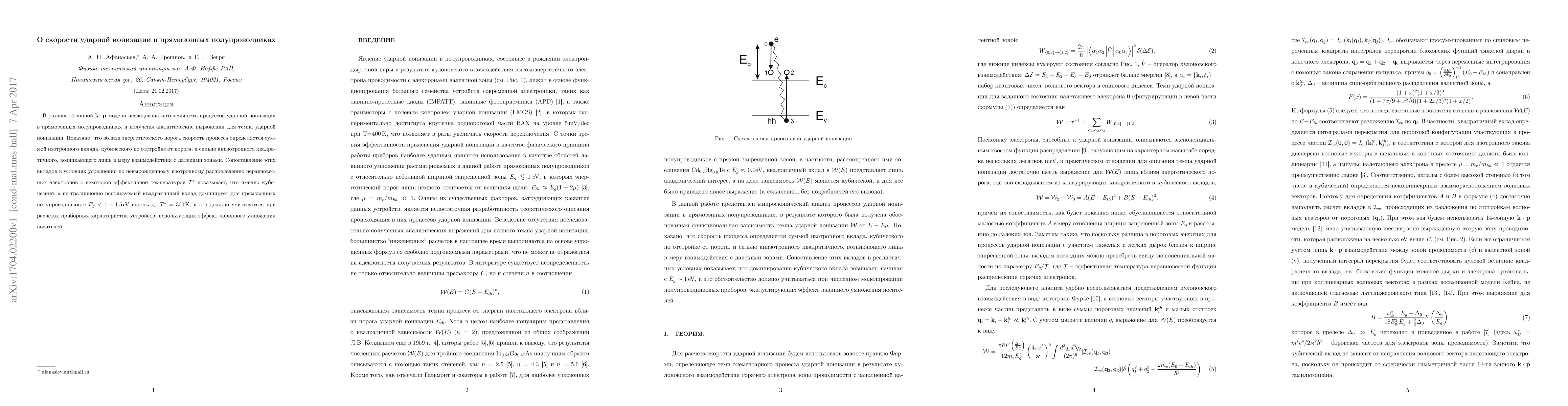 This paper presents a quantum-mechanical theory for impact ionization in direct gap semiconductors, showing that the ionization rate's energy dependence near the threshold is a superposition of anisotropic and isotropic terms, with the cubic term dominating at room temperature for materials with band gaps up to 1.5 eV. The coefficients are derived using a 14-band k·p model.
