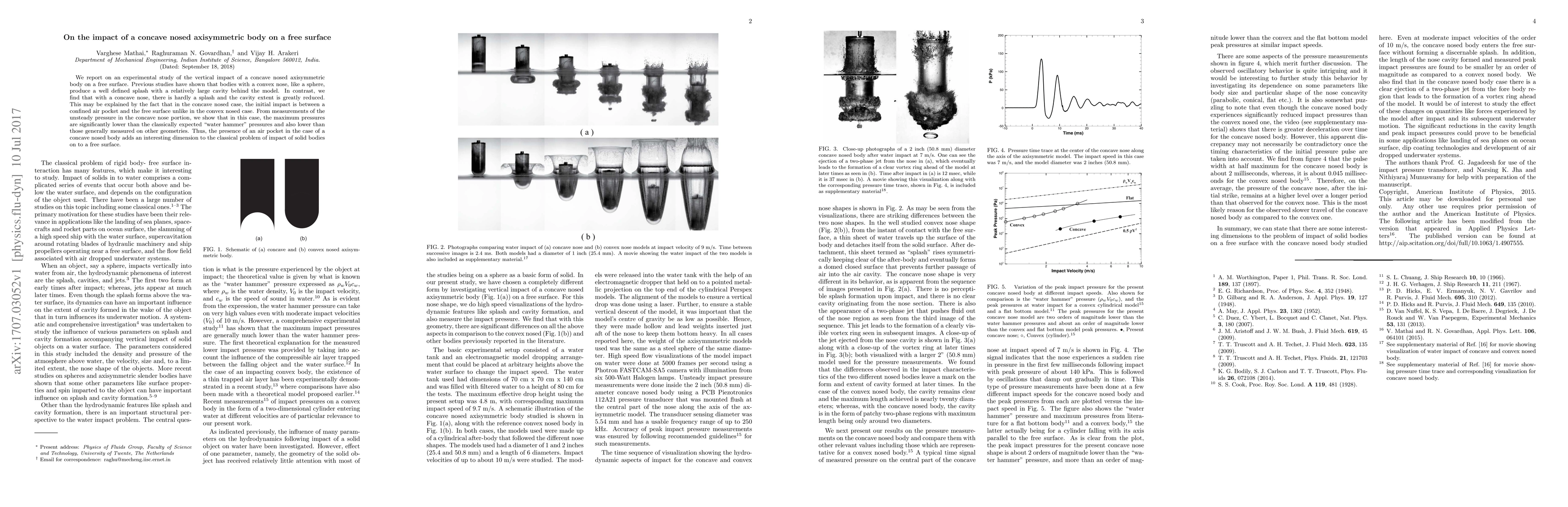 Researchers studied how a concave-nosed body affects water impact, finding reduced splash formation and lower pressure readings compared to convex-nosed bodies.