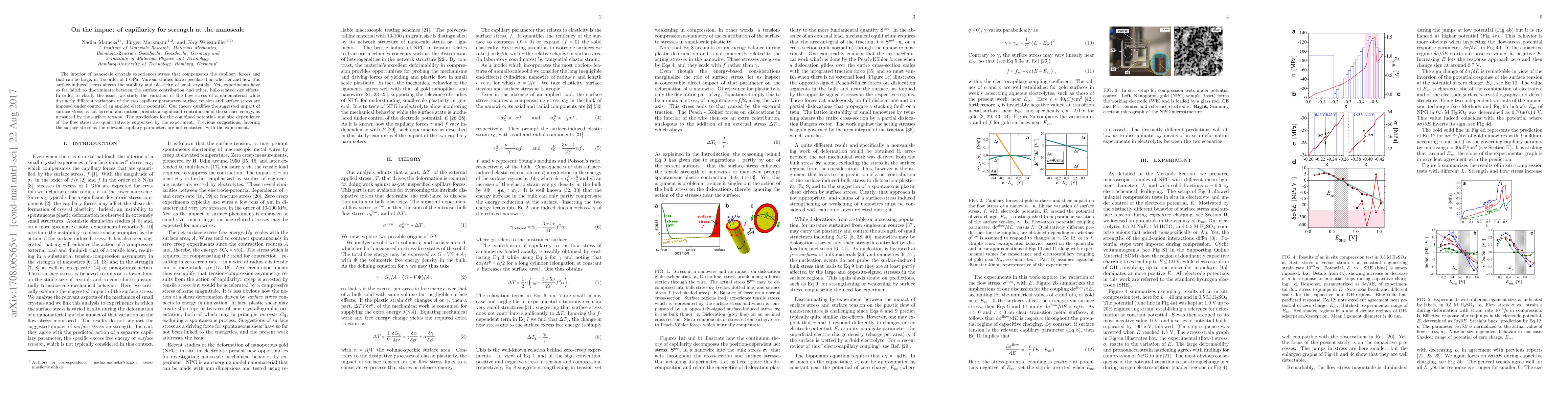 The interior of nanoscale crystals experiences stress that compensates the capillary forces and that can be large, in the order of 1 GPa. Various studies have speculated on whether and how this surface-induced stress affects the stability and plasticity of small crystals. Yet, experiments have so far failed to discriminate between the surface contribution and other, bulk-related size effects. In order to clarify the issue, we study the variation of the flow stress of a nanomaterial while distinctly different variations of the two capillary parameters surface tension and surface stress are imposed under control of an applied electric potential. Our theory qualifies the suggested impact of $\textit{surface stress}$ as not forceful and instead predicts a significant contribution of the surface energy, as measured by the $\textit{surface tension}$. The predictions for the combined potential- and size dependence of the flow stress are quantitatively supported by the experiment. Previous suggestions, favoring the surface stress as the relevant capillary parameter, are not consistent with the experiment.