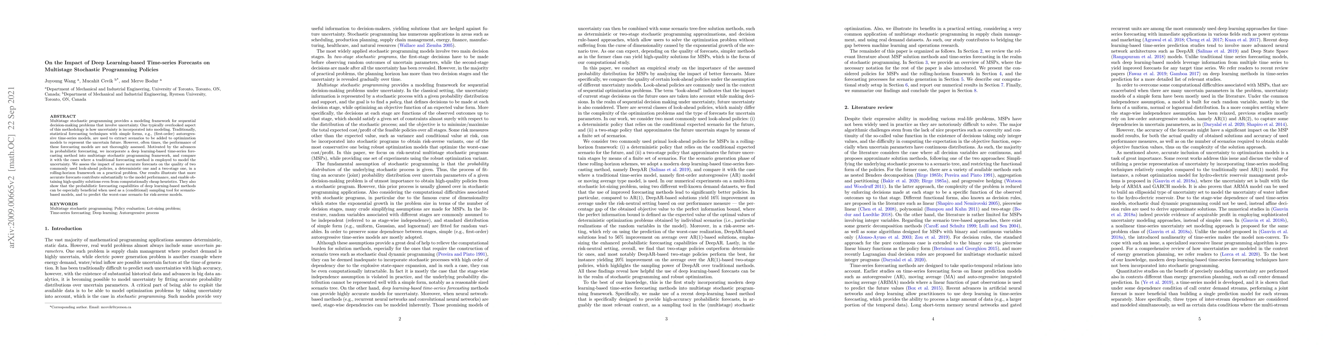 This paper investigates the impact of deep learning-based time-series forecasts on multistage stochastic programming policies, comparing them to traditional forecasting methods. Results show that more accurate forecasts enhance model performance and improve the quality of look-ahead policies, especially benefiting risk-averse models.