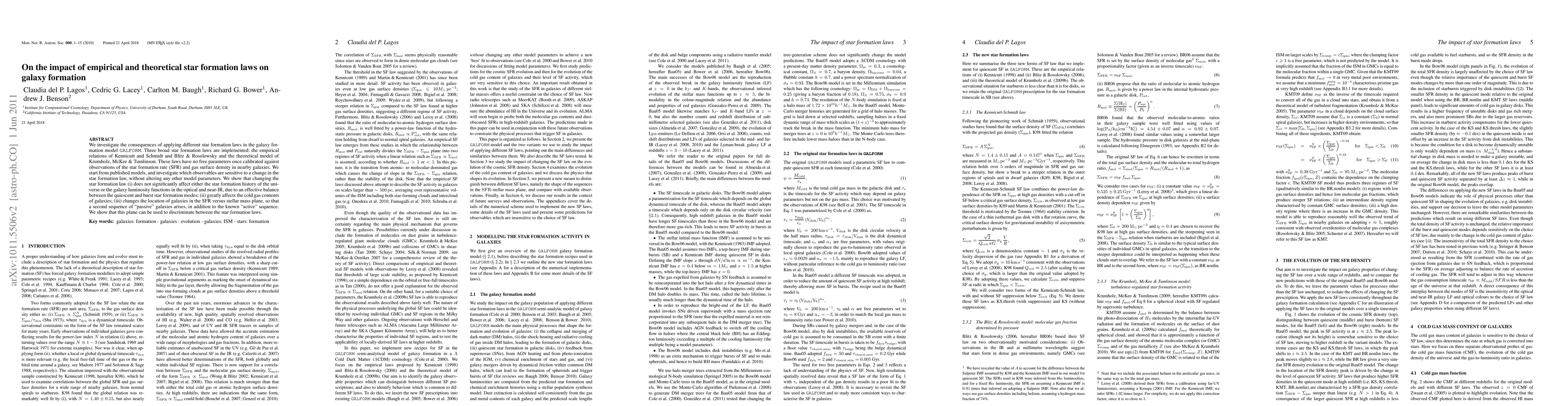 This paper examines the effects of different star formation laws on galaxy formation in the GALFORM model, finding that while they do not significantly alter the universe's star formation history or galaxy luminosity functions, they notably impact galaxy gas contents and introduce a second "passive" sequence in the SFR versus stellar mass plane.