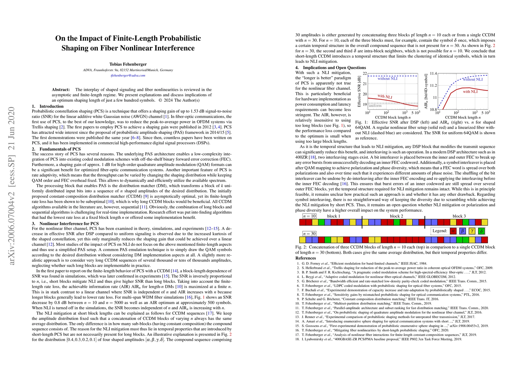 Summary: This paper reviews the effects of finite-length probabilistic shaping on fiber nonlinear interference, finding that an optimal shaping length of a few hundred symbols significantly mitigates interference, highlighting the importance of shaping in practical communication systems.