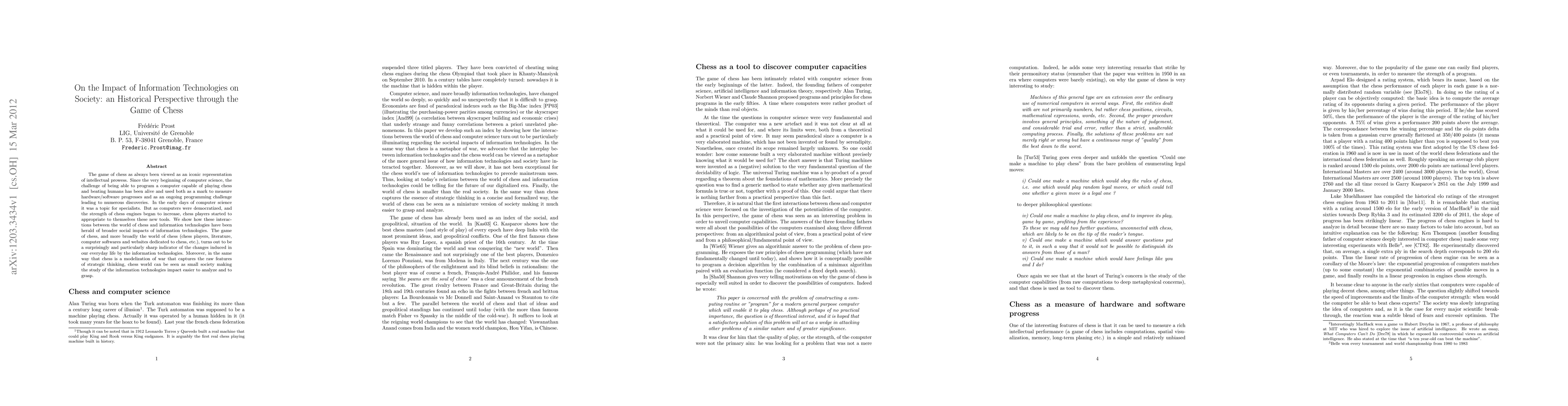 The game of chess as always been viewed as an iconic representation of intellectual prowess. Since the very beginning of computer science, the challenge of being able to program a computer capable of playing chess and beating humans has been alive and used both as a mark to measure hardware/software progresses and as an ongoing programming challenge leading to numerous discoveries. In the early days of computer science it was a topic for specialists. But as computers were democratized, and the strength of chess engines began to increase, chess players started to appropriate to themselves these new tools. We show how these interactions between the world of chess and information technologies have been herald of broader social impacts of information technologies. The game of chess, and more broadly the world of chess (chess players, literature, computer softwares and websites dedicated to chess, etc.), turns out to be a surprisingly and particularly sharp indicator of the changes induced in our everyday life by the information technologies. Moreover, in the same way that chess is a modelization of war that captures the raw features of strategic thinking, chess world can be seen as small society making the study of the information technologies impact easier to analyze and to grasp.