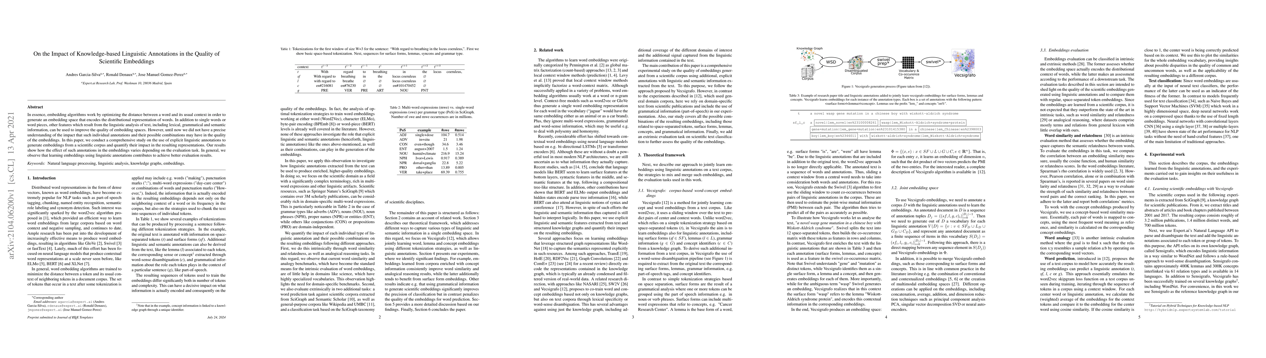 In essence, embedding algorithms work by optimizing the distance between a word and its usual context in order to generate an embedding space that encodes the distributional representation of words. In addition to single words or word pieces, other features which result from the linguistic analysis of text, including lexical, grammatical and semantic information, can be used to improve the quality of embedding spaces. However, until now we did not have a precise understanding of the impact that such individual annotations and their possible combinations may have in the quality of the embeddings. In this paper, we conduct a comprehensive study on the use of explicit linguistic annotations to generate embeddings from a scientific corpus and quantify their impact in the resulting representations. Our results show how the effect of such annotations in the embeddings varies depending on the evaluation task. In general, we observe that learning embeddings using linguistic annotations contributes to achieve better evaluation results.
