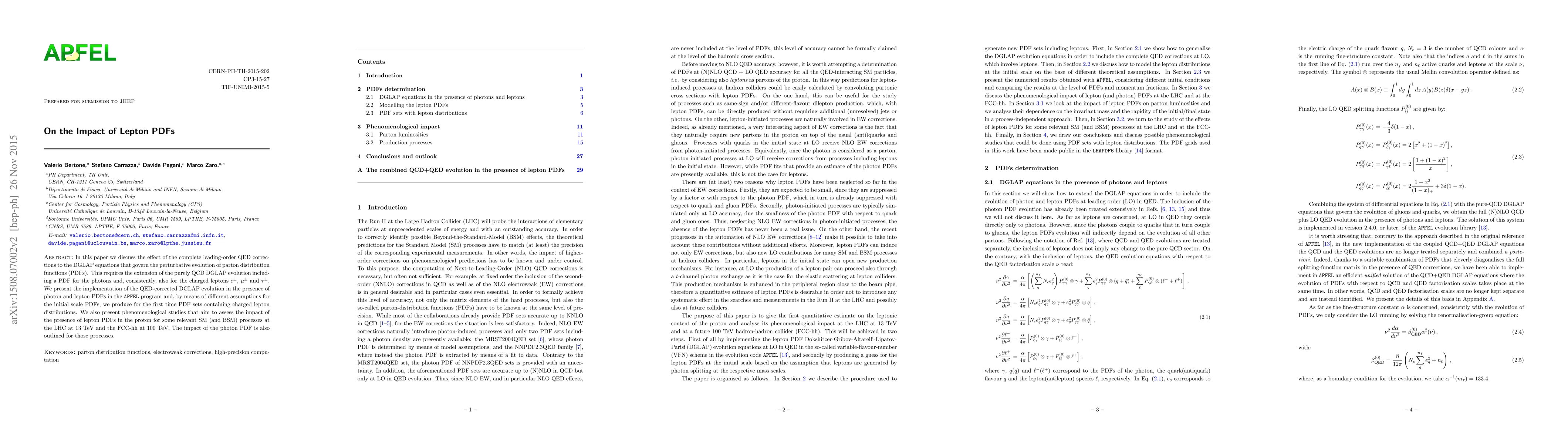 This paper extends the DGLAP evolution to include QED corrections and introduces lepton and photon parton distribution functions (PDFs) in the APFEL program. It assesses the impact of these lepton PDFs on Standard Model and beyond processes at the LHC and FCC-hh.